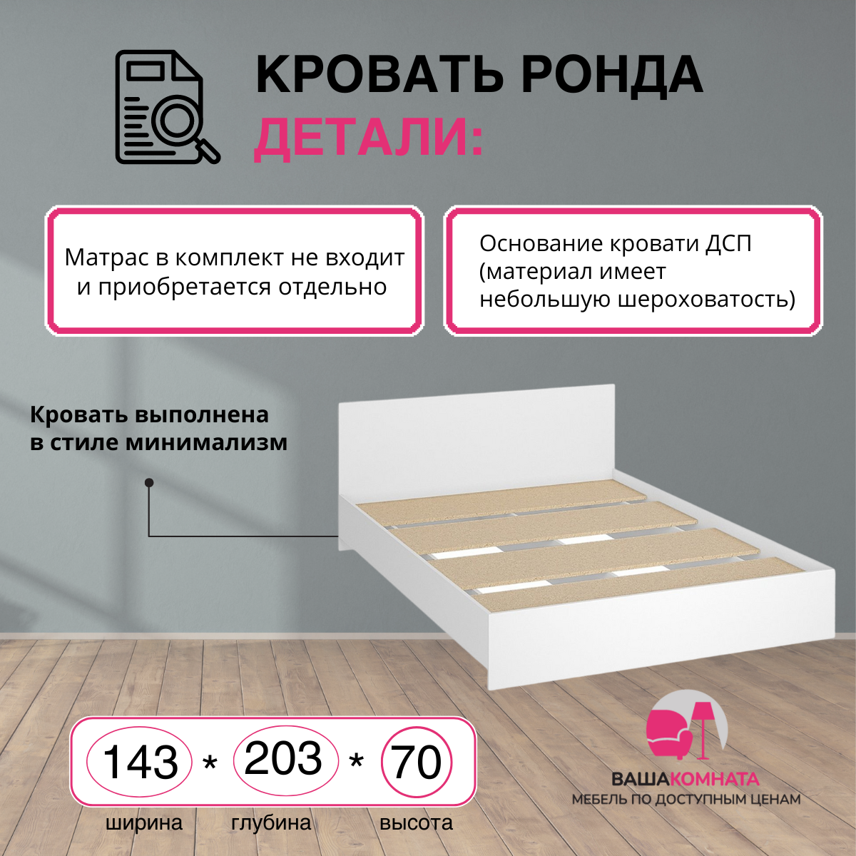 Кровать двуспальная Интерьер-Центр Ронда, ЛДСП, в стиле минимализма, без основания, 140x200см, цвет венге 6 070 ₽