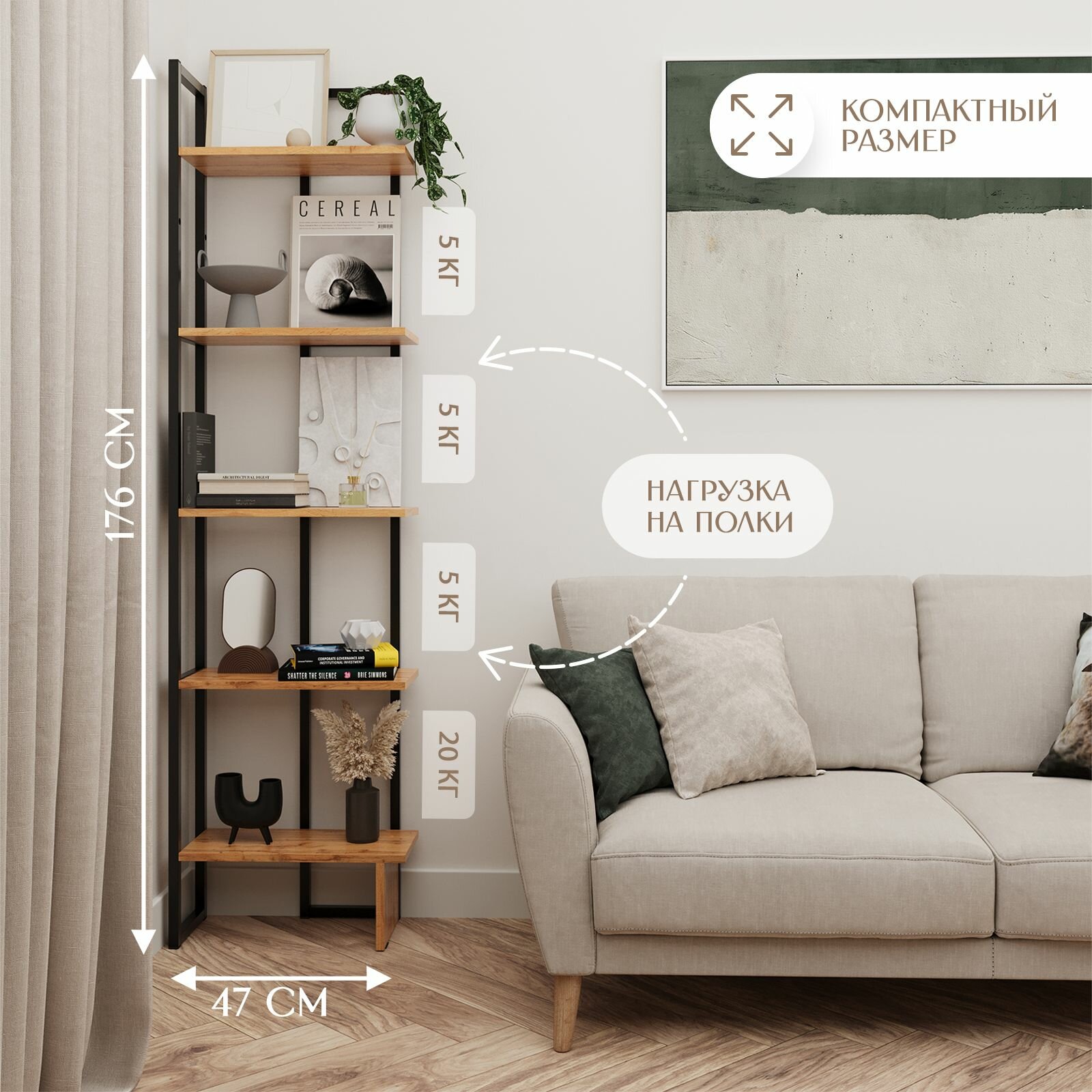 Стеллаж Айсберг Лофт 40/6 / Черный/ с полками дуб крафт табак/ Для дачи/ для дома/ для книг/ в офис