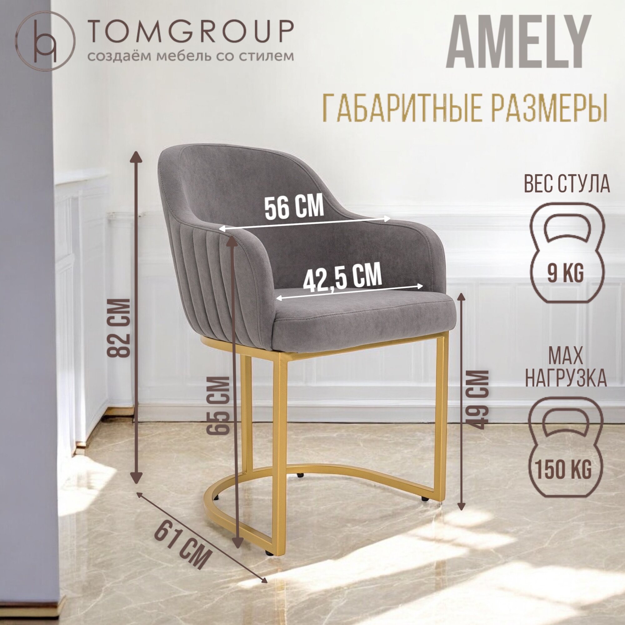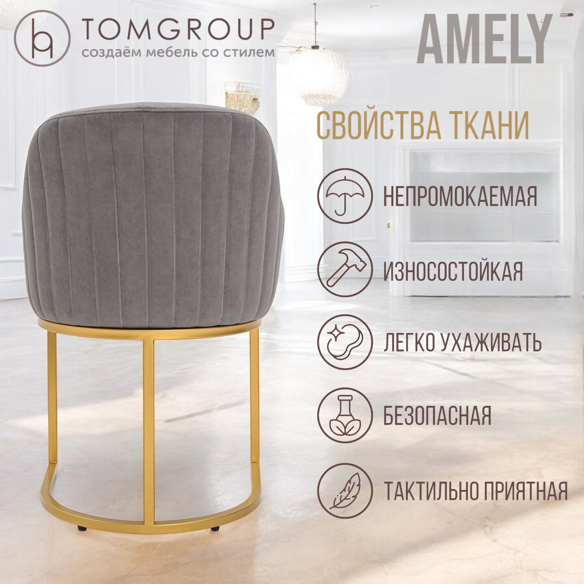 Стул TOMGROUP Amely Gray/Gold, подлокотники, ГОСТ, золотой каркас, серый велюр — дом, офис информация: