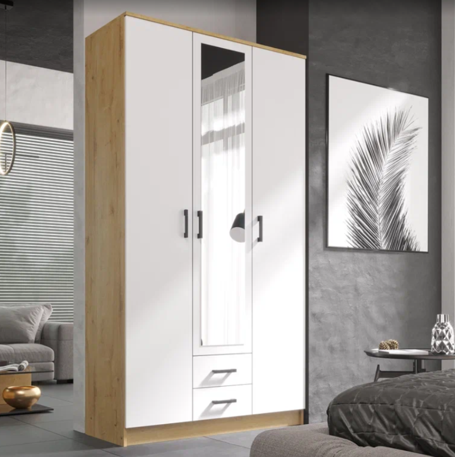 Первый Мебельный Распашной шкаф для одежды Трио с полками, с ящиками, с зеркалом, 120х49х220 см, Дуб вотан / Белый гладкий