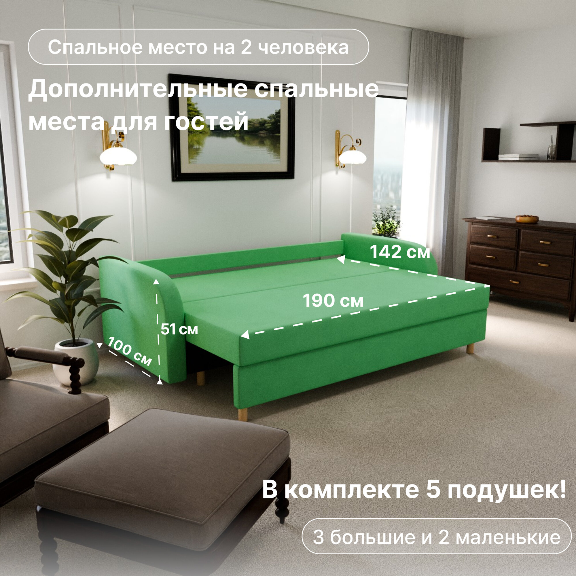| Особенности | раскладная конструкция, с подлокотниками, съемные подушки, ящик для белья |