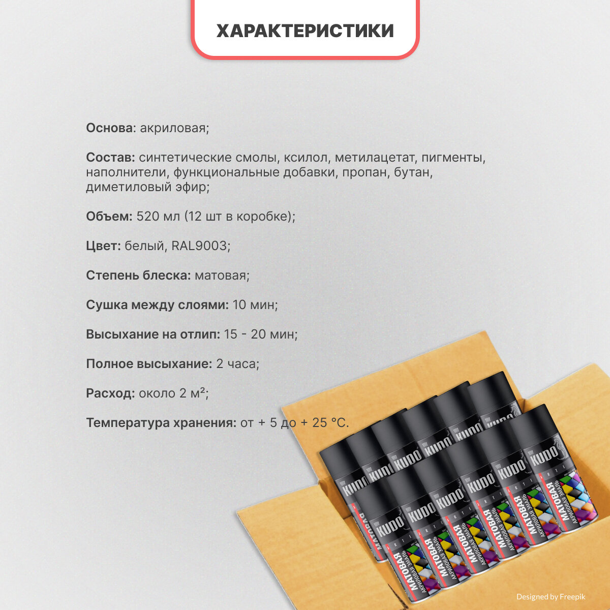 Отзывы на Аэрозольная краска эмаль KUDO, 520 мл, RAL 9003, акриловая белая матовая, 12 шт
