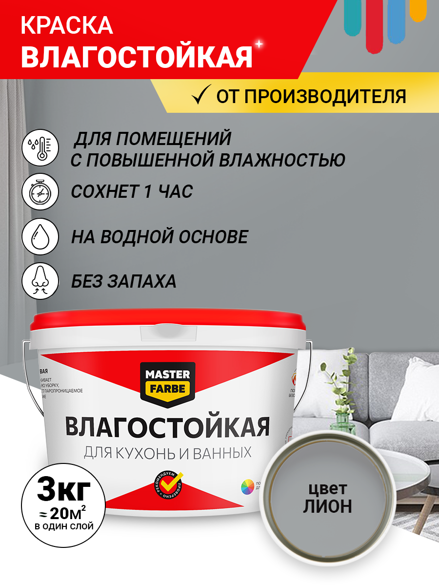 Мы выбрали 10 лучших цен на Краска акриловая влагостойкая для помещений с повышенной влажностью MASTERFARBE, серый, 3 кг. Перед тем как купить Краска акриловая влагостойкая для помещений с повышенной влажностью MASTERFARBE, серый, 3 кг посмотрите найденные предложения из Яндекс Маркета и других сайтов на основе XML фидов.