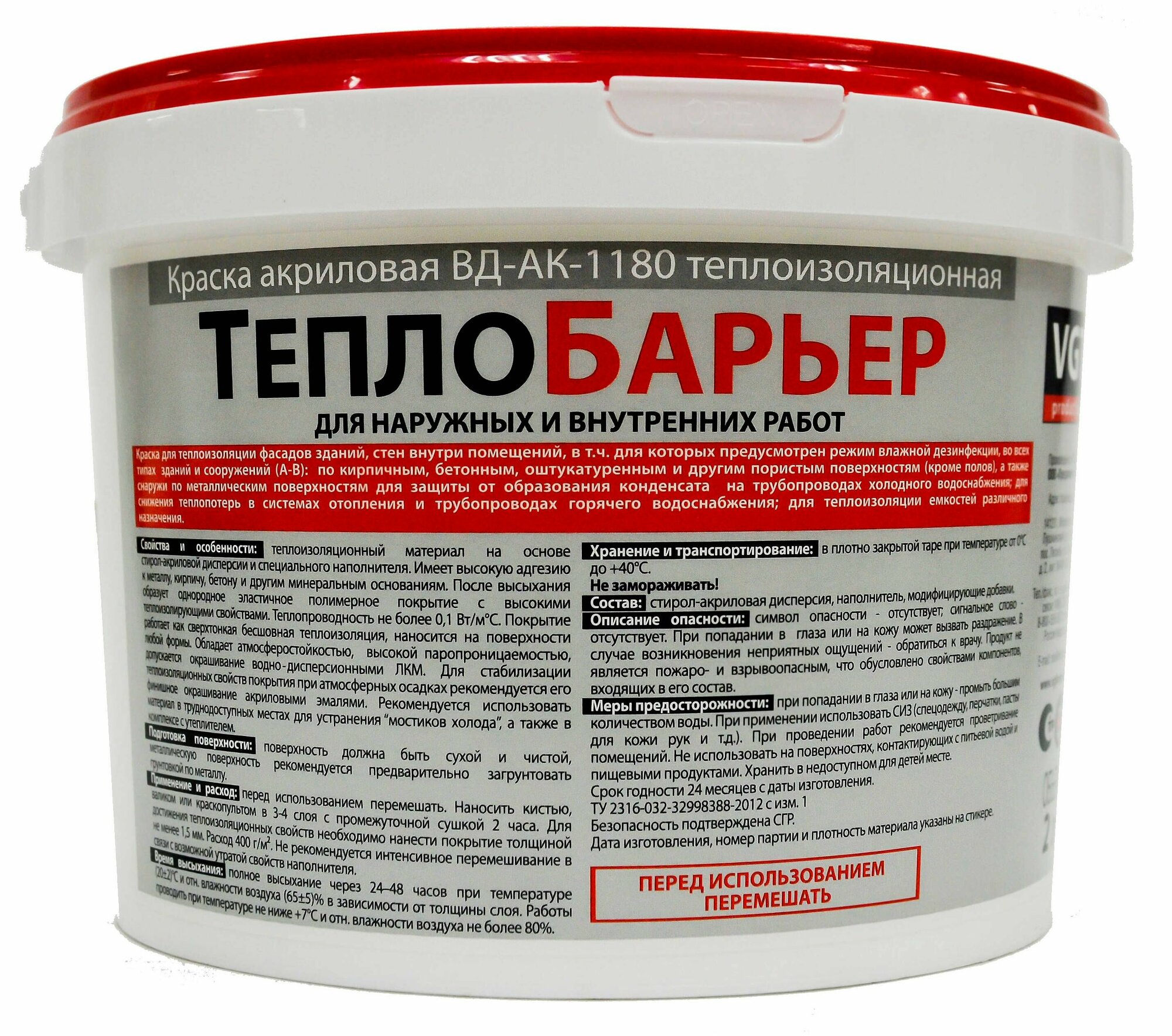 VGT Краска акриловая теплоизоляционная "ТеплоБарьер" для нар/внутр работ 2л/1.1 кг информация: