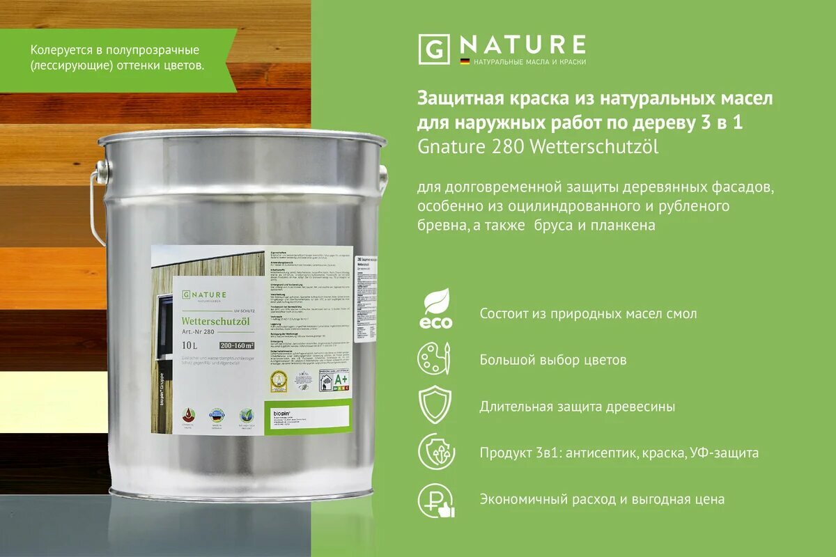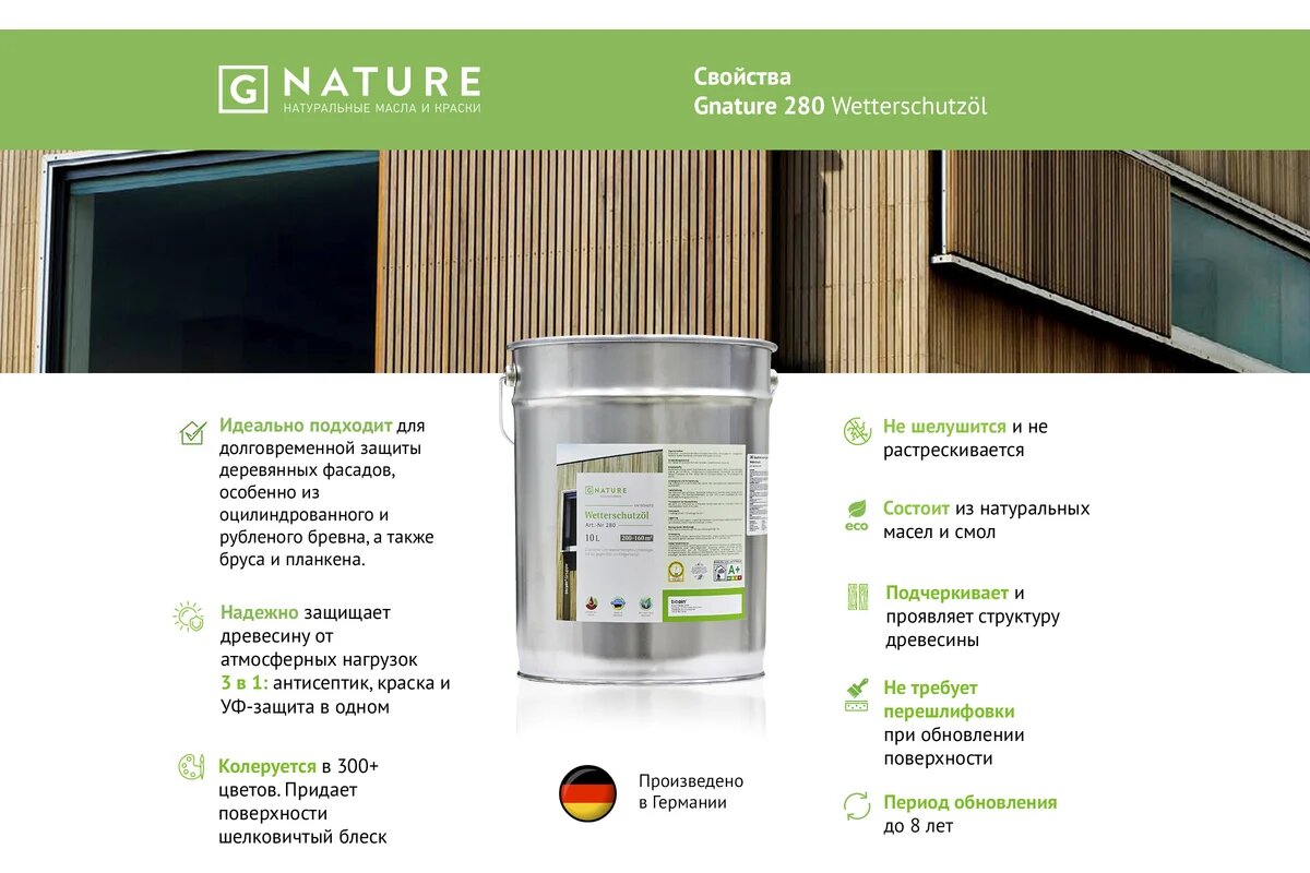 Защитное Масло Gnature 280 Wetterschutzol 10л 2059 Крапива для Наружных, Деревянных Фасадов. 48 880 ₽