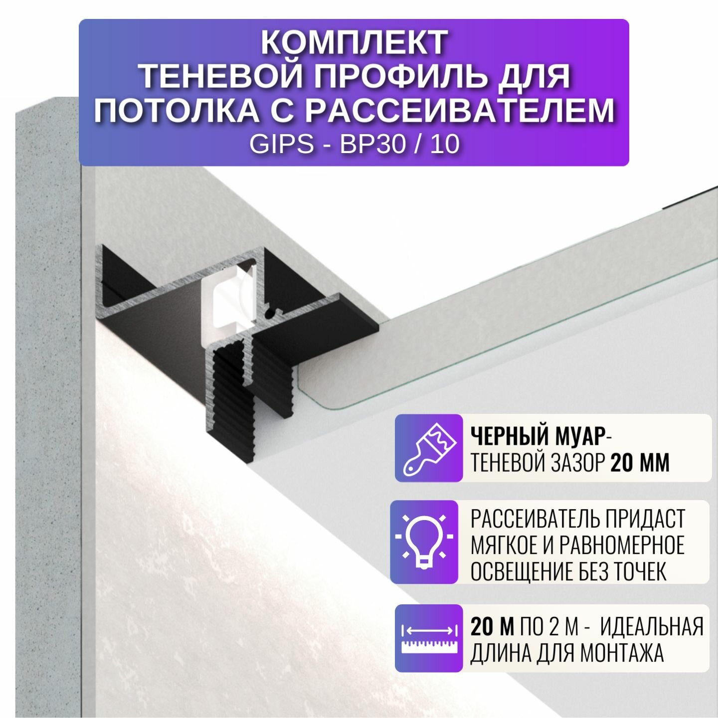 Теневой профиль с рассеивателем для потолка из ГКЛ 2 м, 10 шт, цвет черный информация: