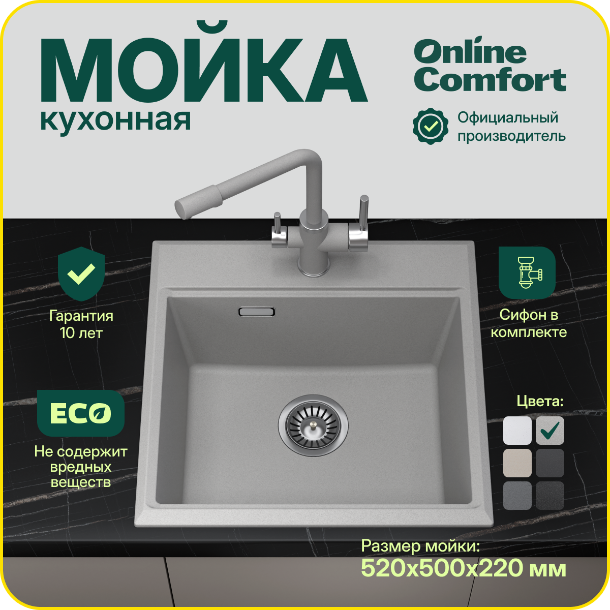 Врезная кухонная мойка Comfort 52х50 см, кварцевая, квадратная, цвет Графит, модель 5202 11 699 ₽