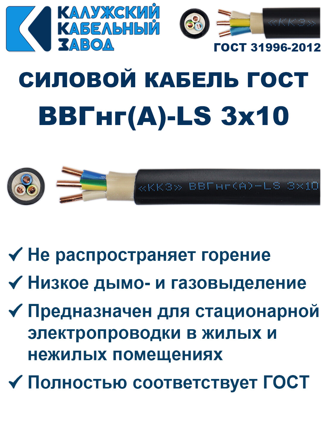 Отзывы на Кабель силовой ВВГнг(А)-LS 3х10 ГОСТ. 20 метров. Калужский кабельный завод