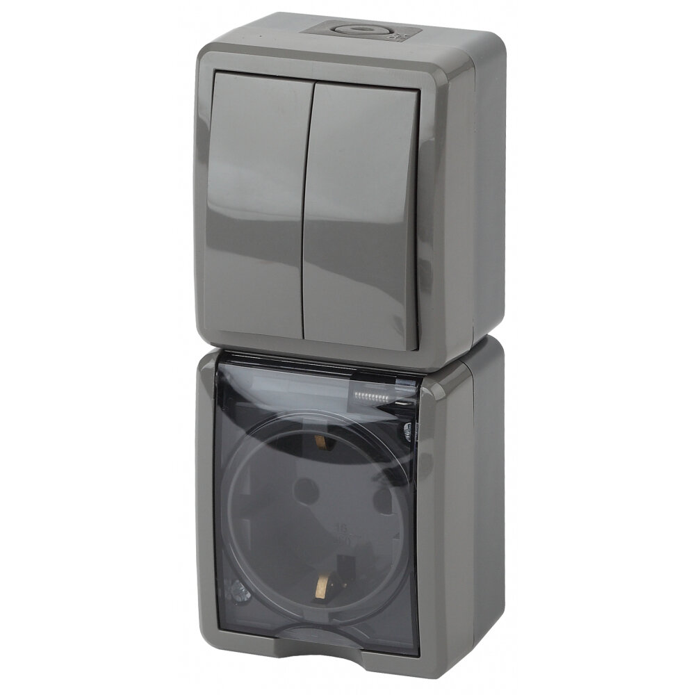 | Дополнительная информация | Блок 1-клавишный выключатель и розетка ЭРА Эксперт IP54 вертикальный с/з серый |
