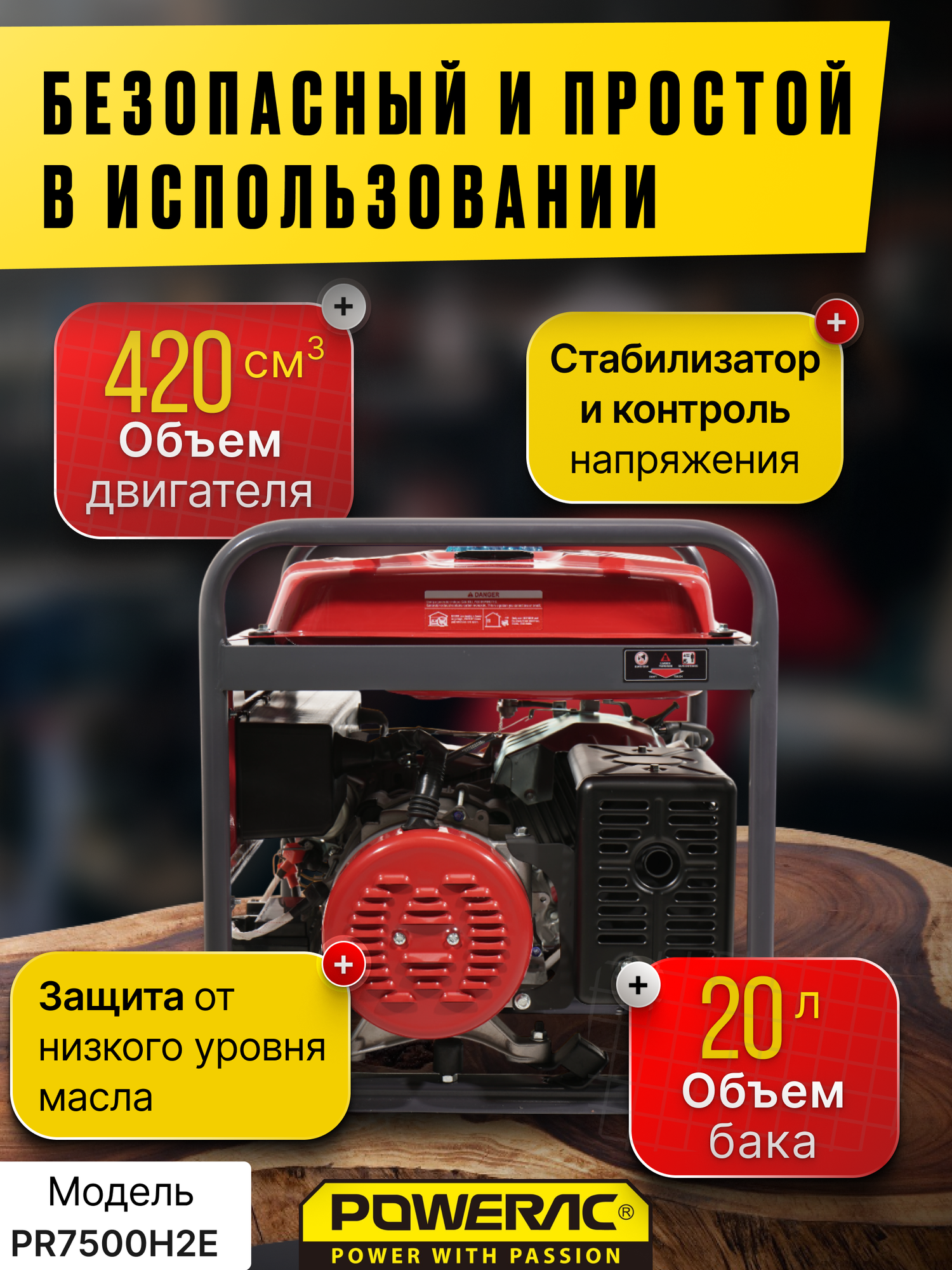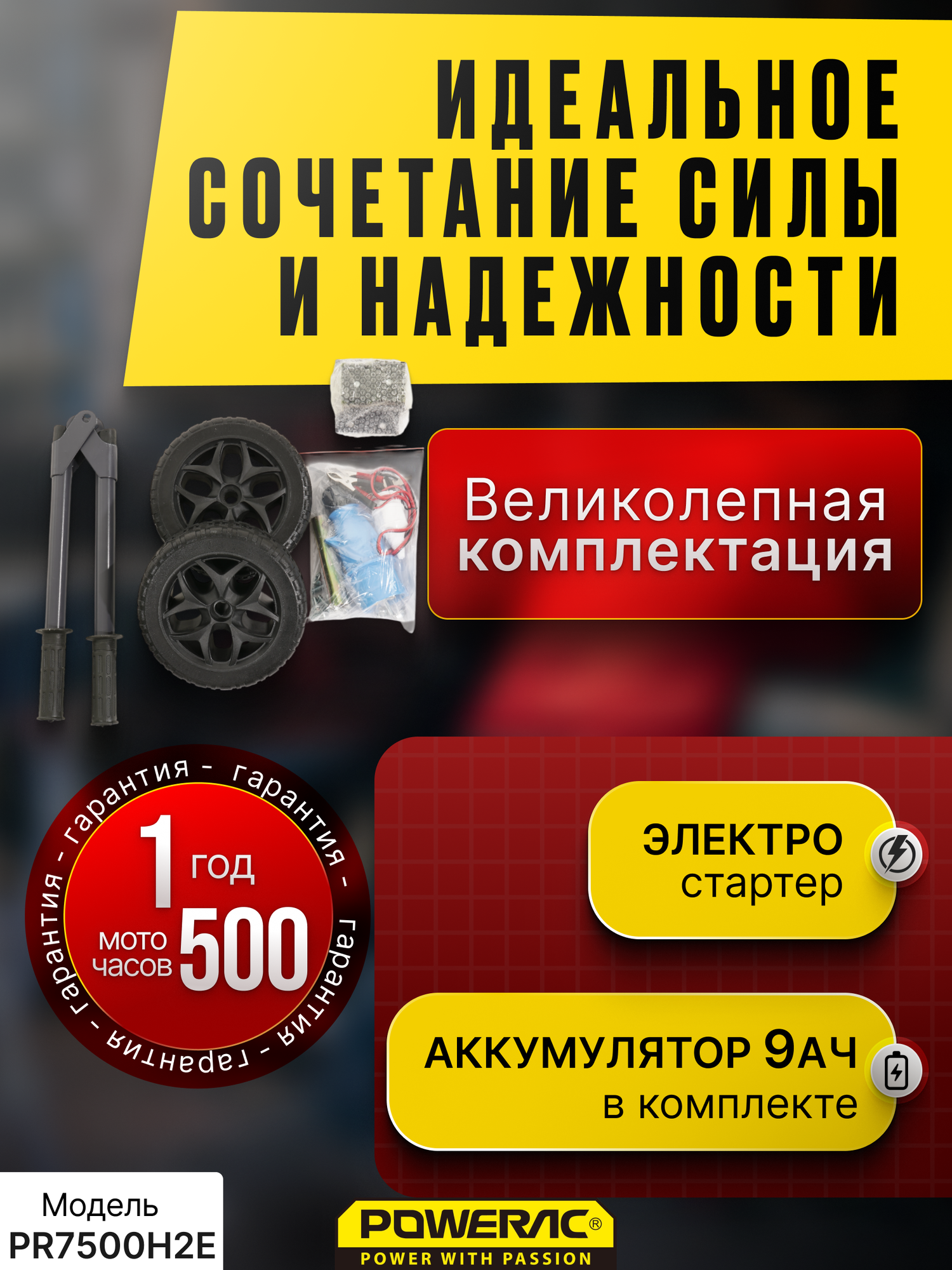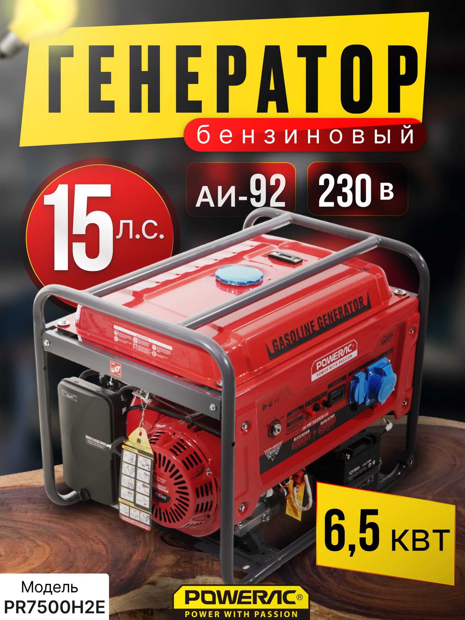 Генератор бензиновый электрический Powerac PR7500H2E (6.5 кВт, 220В, 15л. с, ЭЛЕКТРОСТАРТЕР + АКБ) информация: