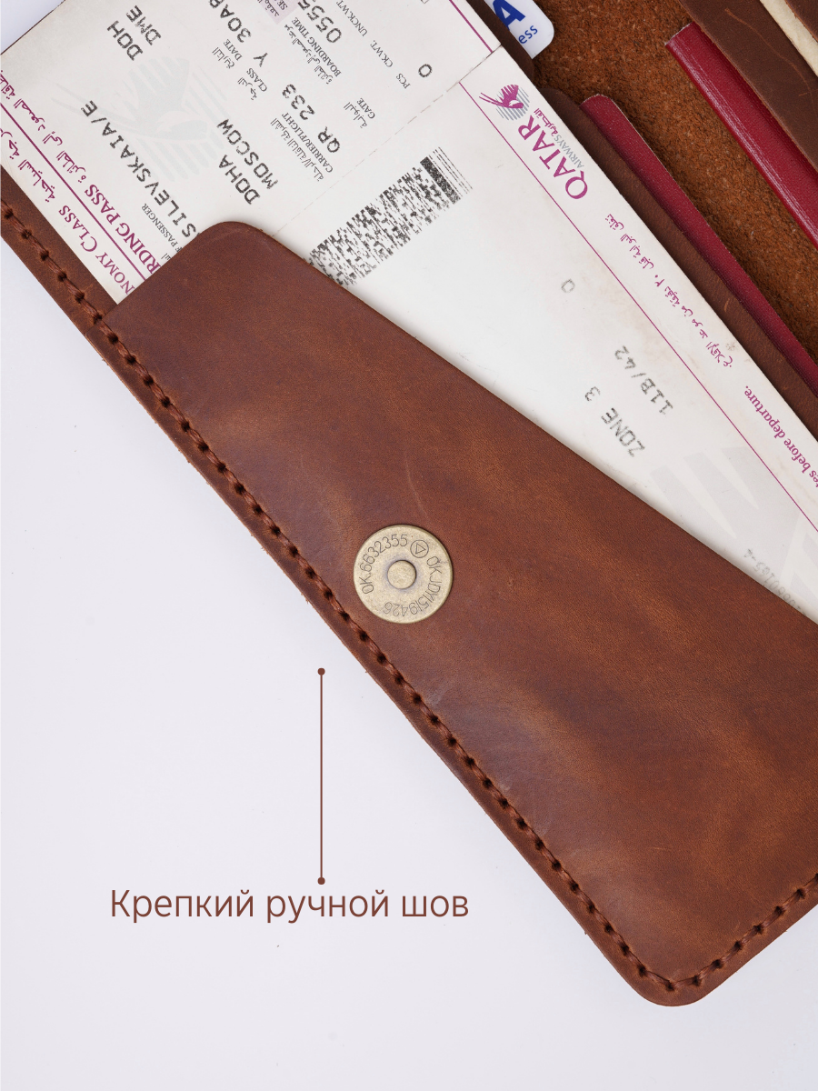 | Особенности модели | отделение для авиабилетов, отделение для денежных купюр, отделение для карт, отделение для паспорта, подарочная упаковка, ручная работа |