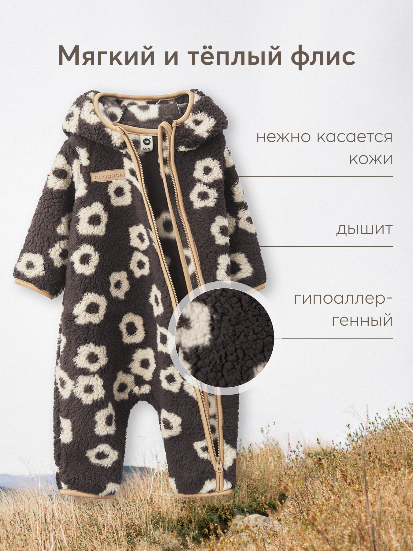 89054, Комбинезон флисовый для новорожденных Happy Baby, флисовый, с ушками, демисезонный, коричневый, размер 68-74 2 239 ₽
