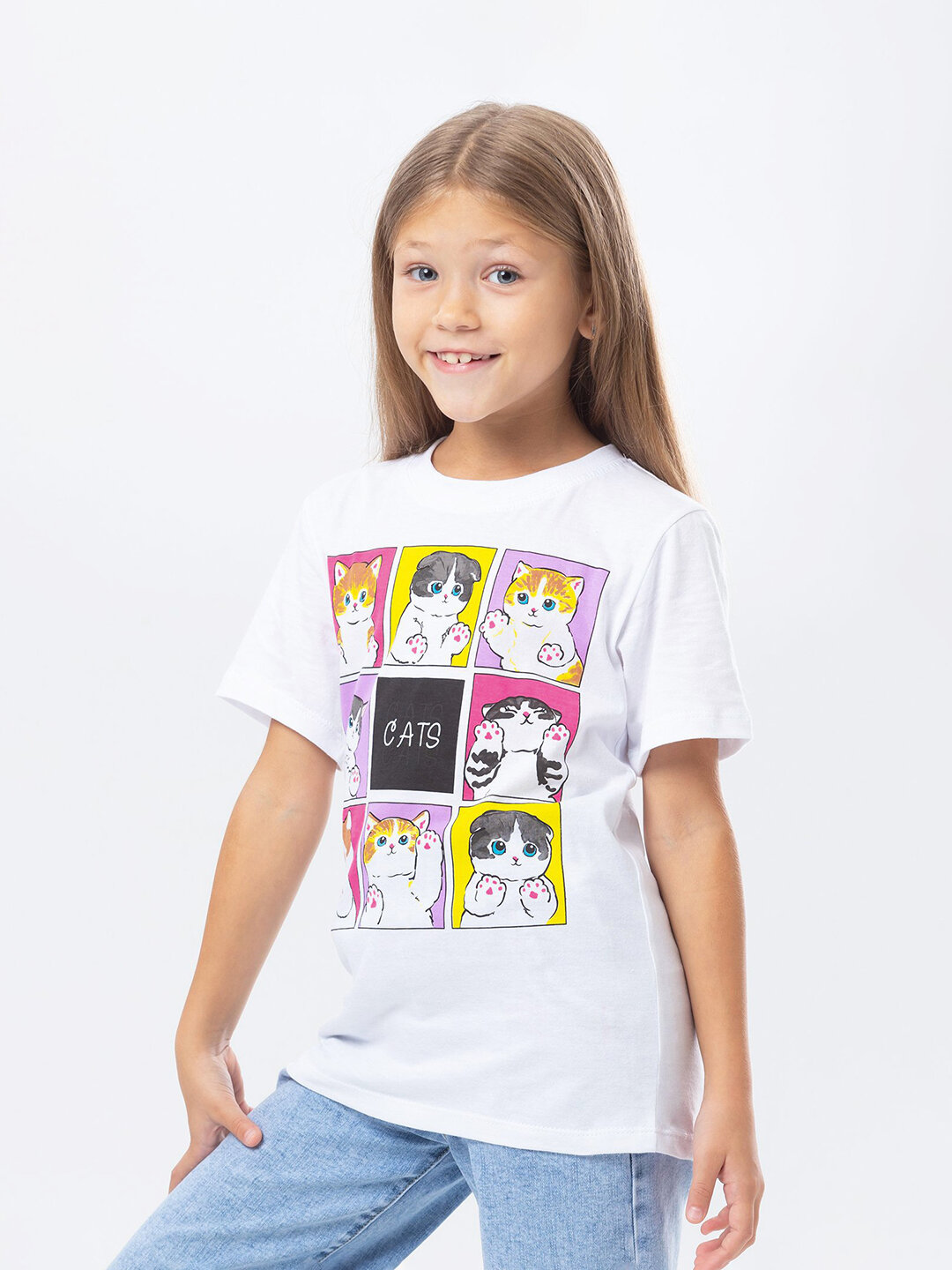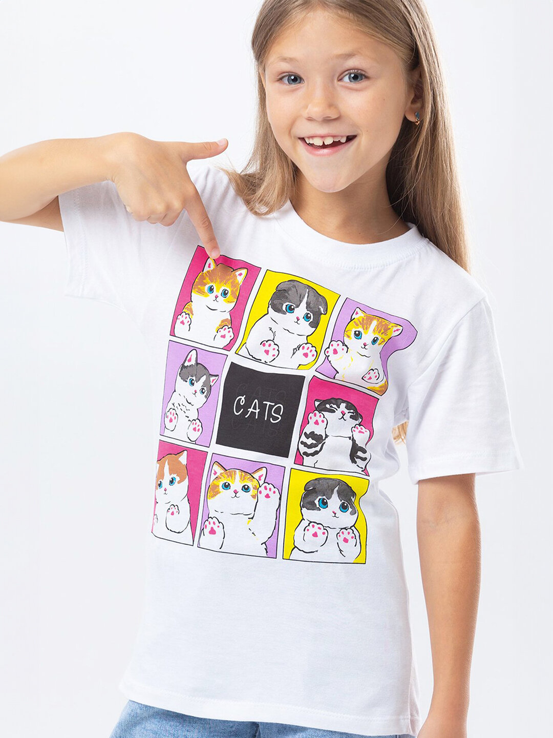 Детская футболка с принтом для девочки для мальчика хлопок HappyFox, HF00123 размер 104, цвет белый.коты 631 ₽
