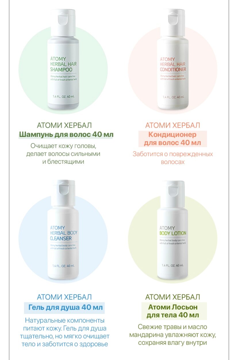 | Состав | Шампунь Atomy Herbal Hair 40 мл. Кондиционер Atomy Herbal Hair 40 мл. Гель для душа Atomy Herbal body 40 мл. Лосьон для тела Atomy Body lotion / 40 мл. Гидрофильное масло Atomy Deep Cleanser 40 мл. Пенка для умывания Atomy Foam Cleanser 40 мл. |