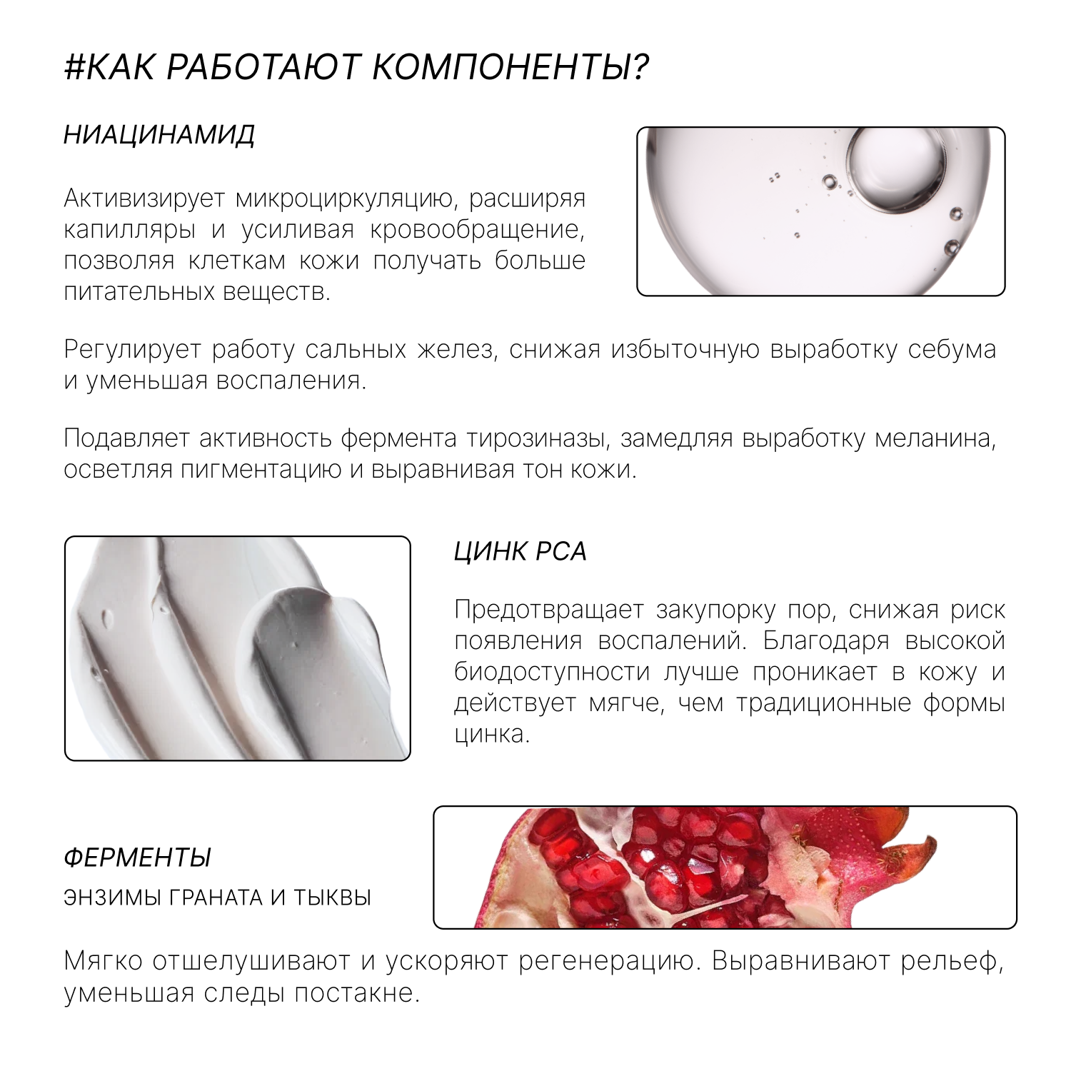 | Активный ингредиент | аллантоин / аргинин / бакучиол / бета-глюкан / бетаин / витамин A (ретинол) / витамин B3 (ниацинамид) / глицерин / глицин / лизин / пантенол (провитамин B5) / пептиды / салициловая кислота / центелла азиатская / цинк / энзимы |
