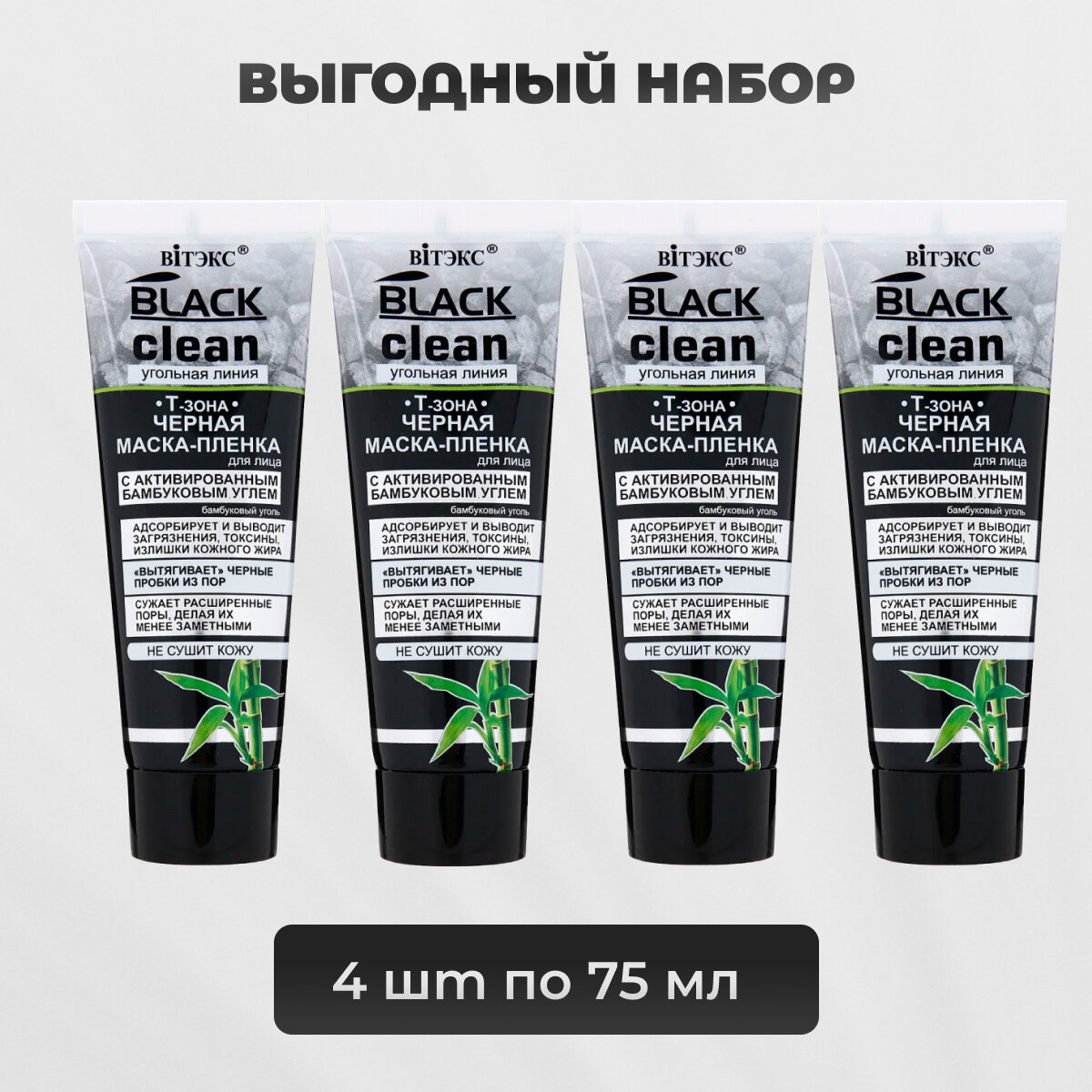 Витекс Маска-пленка от черных точек для Т-зоны с активированным бамбуковым углем Black Clean 4 шт по 75 мл информация: