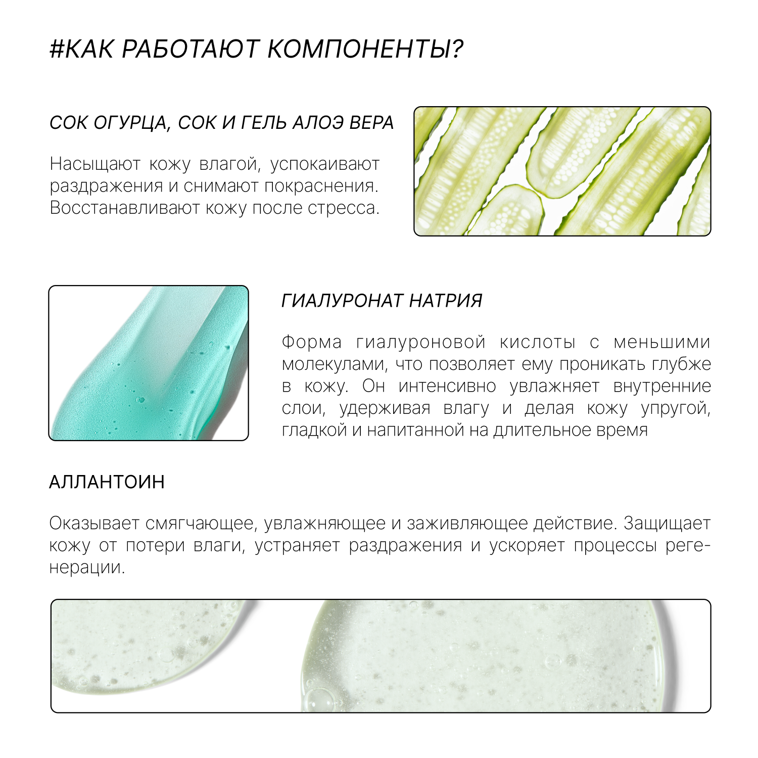 | Активный ингредиент | азелаиновая кислота / аллантоин / аминокислоты / бетаин / витамин A (ретинол) / витамин B3 (ниацинамид) / гиалуроновая кислота / глицерин / глюконолактон / коллаген / кофеин / лецитин / мед / пантенол (провитамин B5) / пептиды / ресвератрол / салициловая кислота / сок алоэ / сок огуречный / уголь / церамиды / цинк / эластин |
