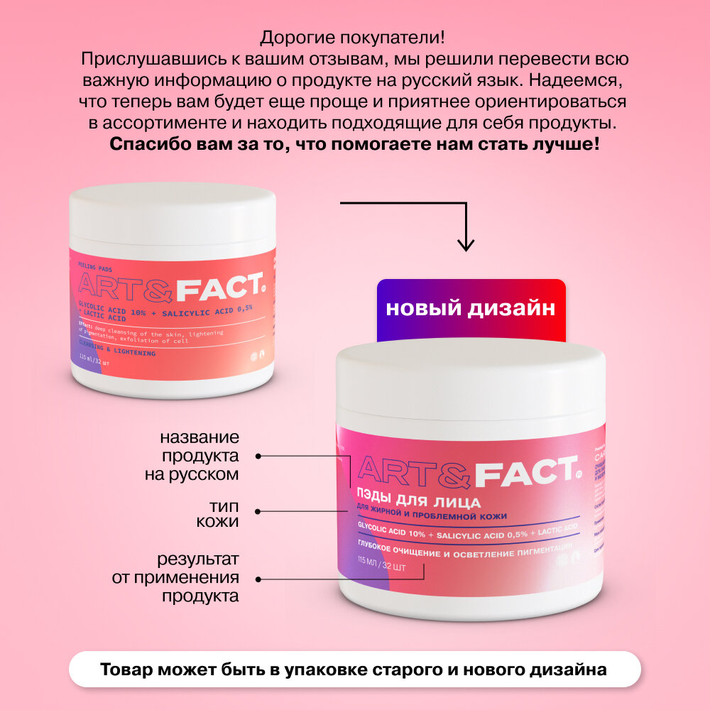 Отзывы на ART&FACT. / Очищающие осветляющие кислотные пилинг-пэды для лица с гликолевой кислотой 10%, салициловой кислотой, 115 мл