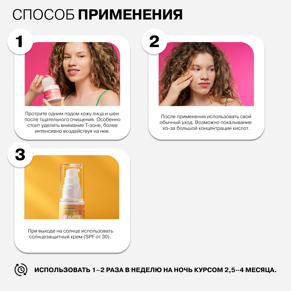 | Способ применения | Протрите одним пэдом кожу лица и шеи после тщательного очищения. Особенно стоит уделить внимание Т-зоне, более интенсивно воздействуя на нее. Использовать 2-3 раза в неделю на ночь курсом 2,5-4 месяца. После применения использовать свой обычный уход. Возможно покалывание из-за большой концентрации кислот. При выходе на солнце использовать солнцезащитный крем (SPF от 35). |