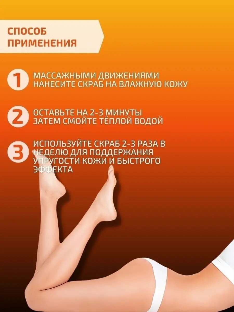 | Способ применения | нанесите скраб на влажную кожу тела интенсивными круговыми массирующими движениями, уделяя особое внимание проблемным зонам. Смойте теплой водой |