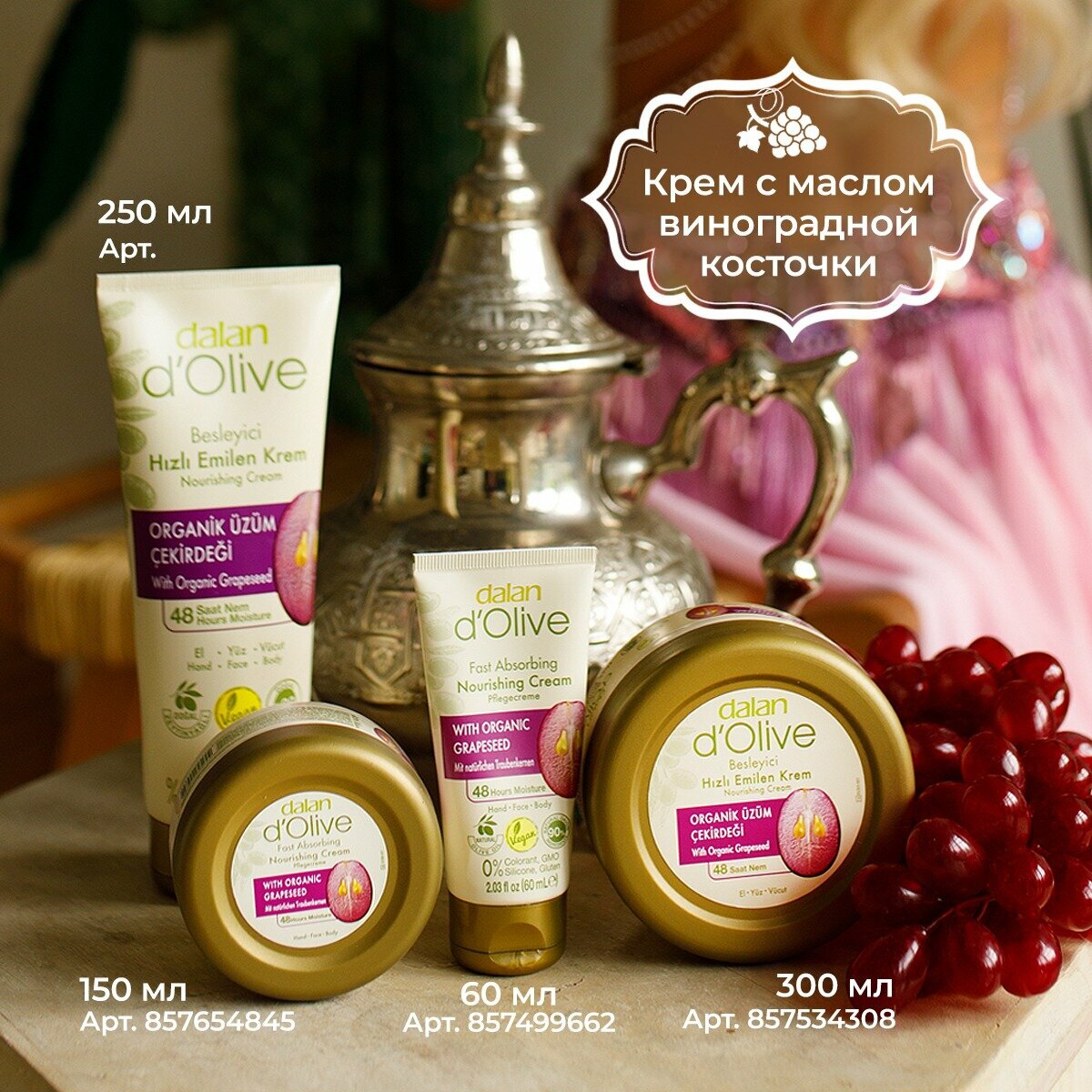 Натуральный турецкий крем для рук и тела Dalan d'Olive Питающий с виноградными косточками, дневной ночной, 300 мл 530 ₽