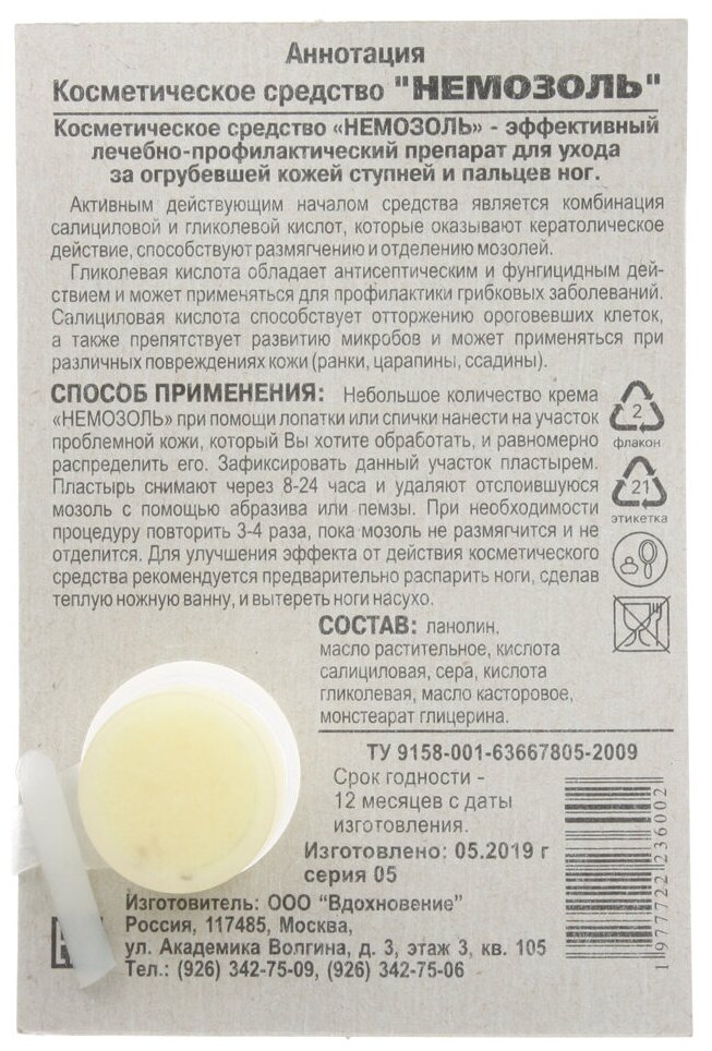 Вдохновение Крем для удаления сухих мозолей Немозоль информация: