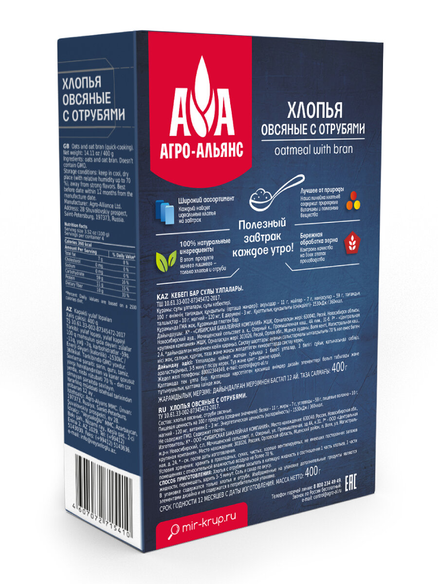 Хлопья овсяные с отрубями Агро-Альянс Экстра, 400 г информация: