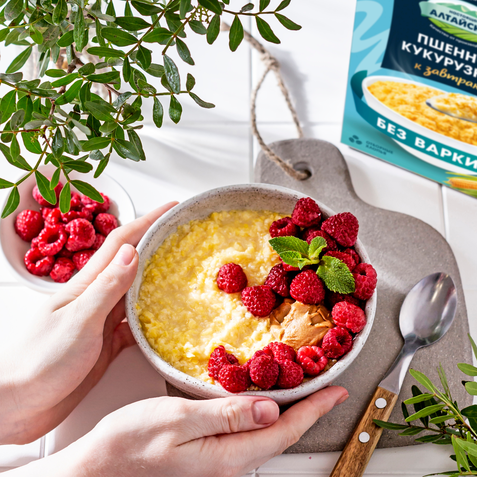 | Дополнительная информация | Выращиваем отборную кукурузу и просо в предгорьях Алтая, которые напитали в себя много солнечного света и воды из горных речек – вот почему пшенно-кукурузные хлопья имеют такой насыщенный жёлтый цвет. Хлопья не требуют варки, что делает ваш завтрак удобным и быстрым в приготовлении. Зерно обрабатывается паром, проходит процесс плющения и от того на сколько зерно расплющено и зависит его дальнейшее время приготовления. Пшенно-кукурузные хлопья также хорошо использовать в качестве панировки. |