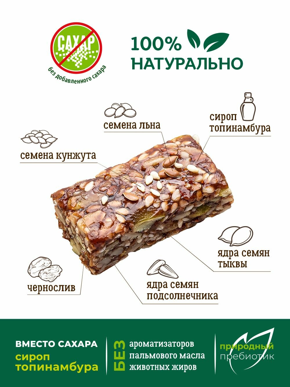 Полезные злаковые конфеты-батончик "Чернослив и семечки" "Vitok" без сахара с топинамбуром/полезная конфета/конфета без сахара/100% натурально 500гр. 406 ₽