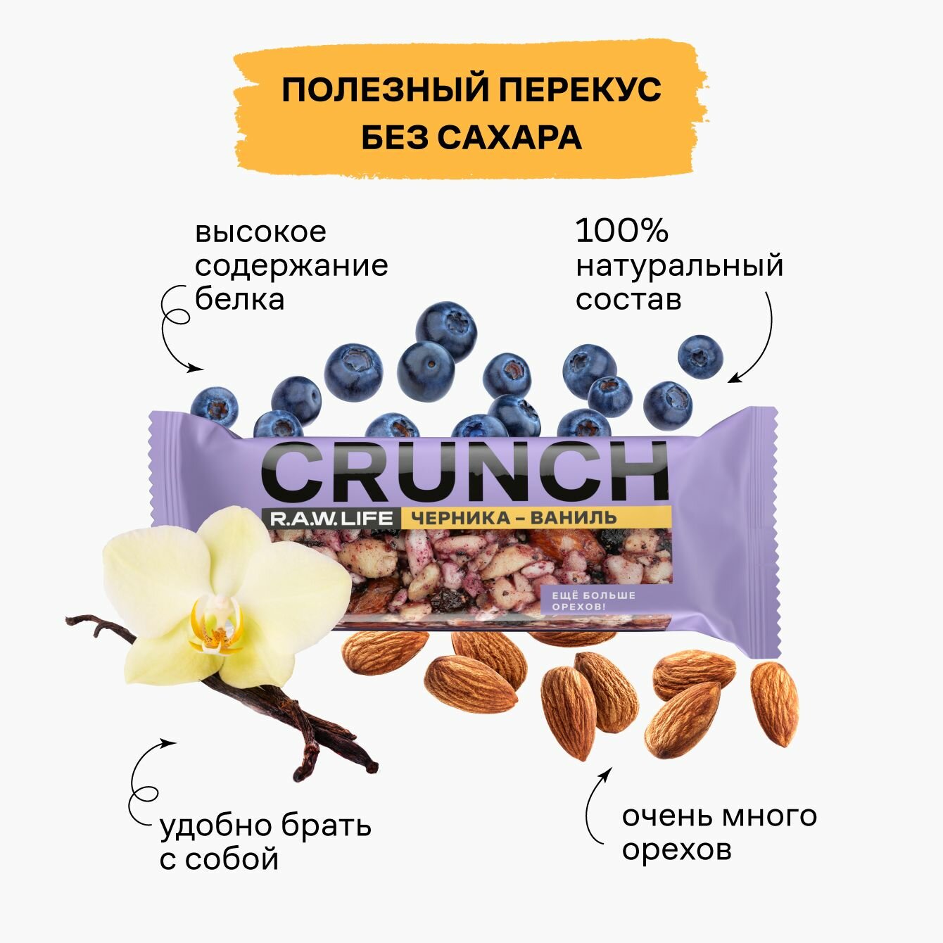 10 цен на Энергетические батончики без сахара R.A.W.LIFE CRUNCH / Злаковые, натуральные, много орехов / Ассорти 12 шт по 30 гр