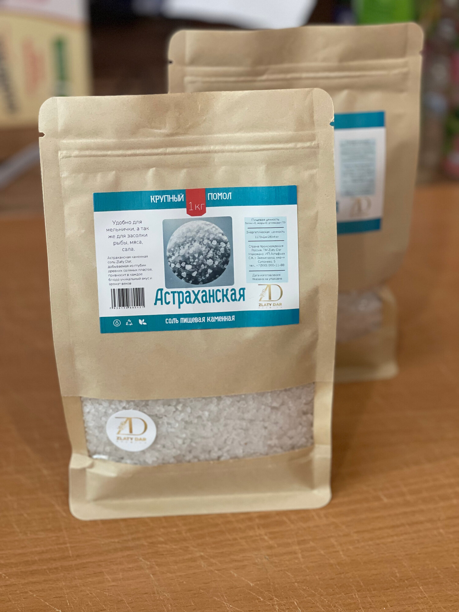 Соль пищевая Астраханская Zlaty Dar, крупный помол, натуральная, дой-пак 1 кг, информация: