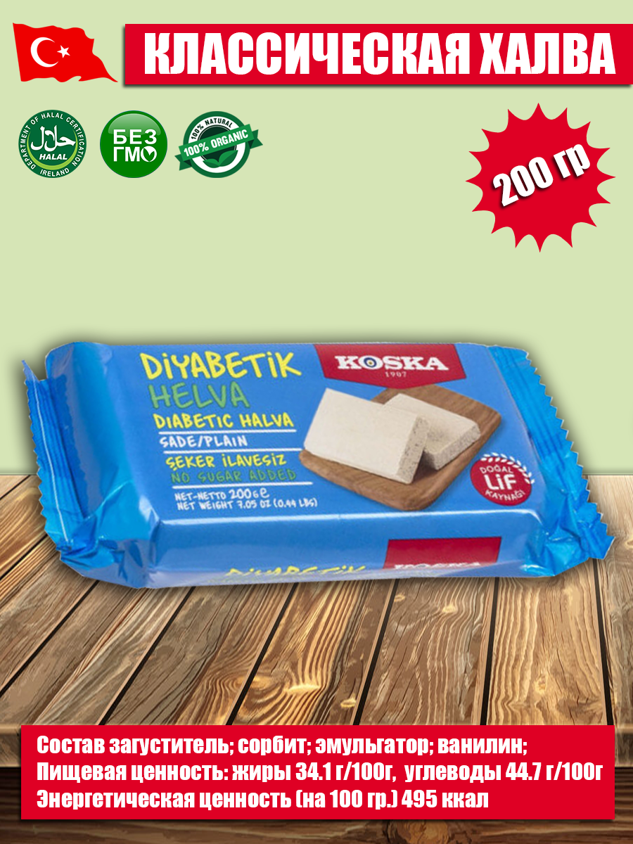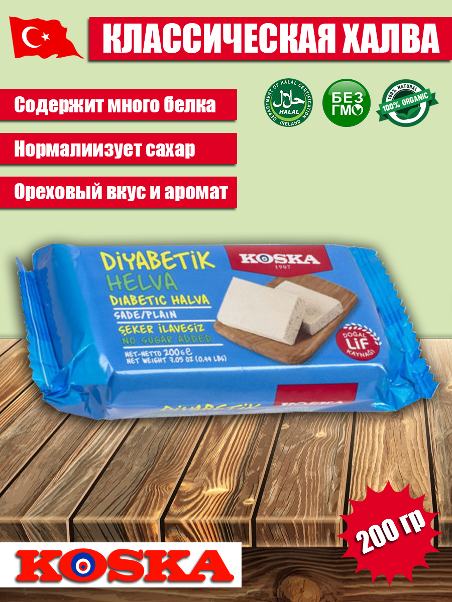 Халва кунжутная без сахара диабетическая 200гр KOSKA, в пластиковом контейнере информация: