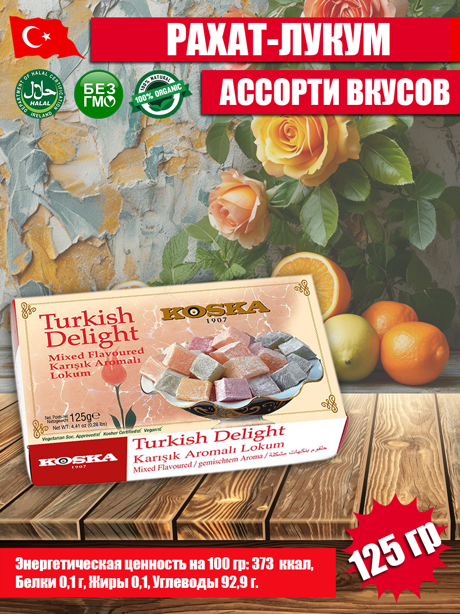Рахат-лукум ассорти вкусов KOSKA 125 гр (KARISIK AROMALI), картонная коробка информация: