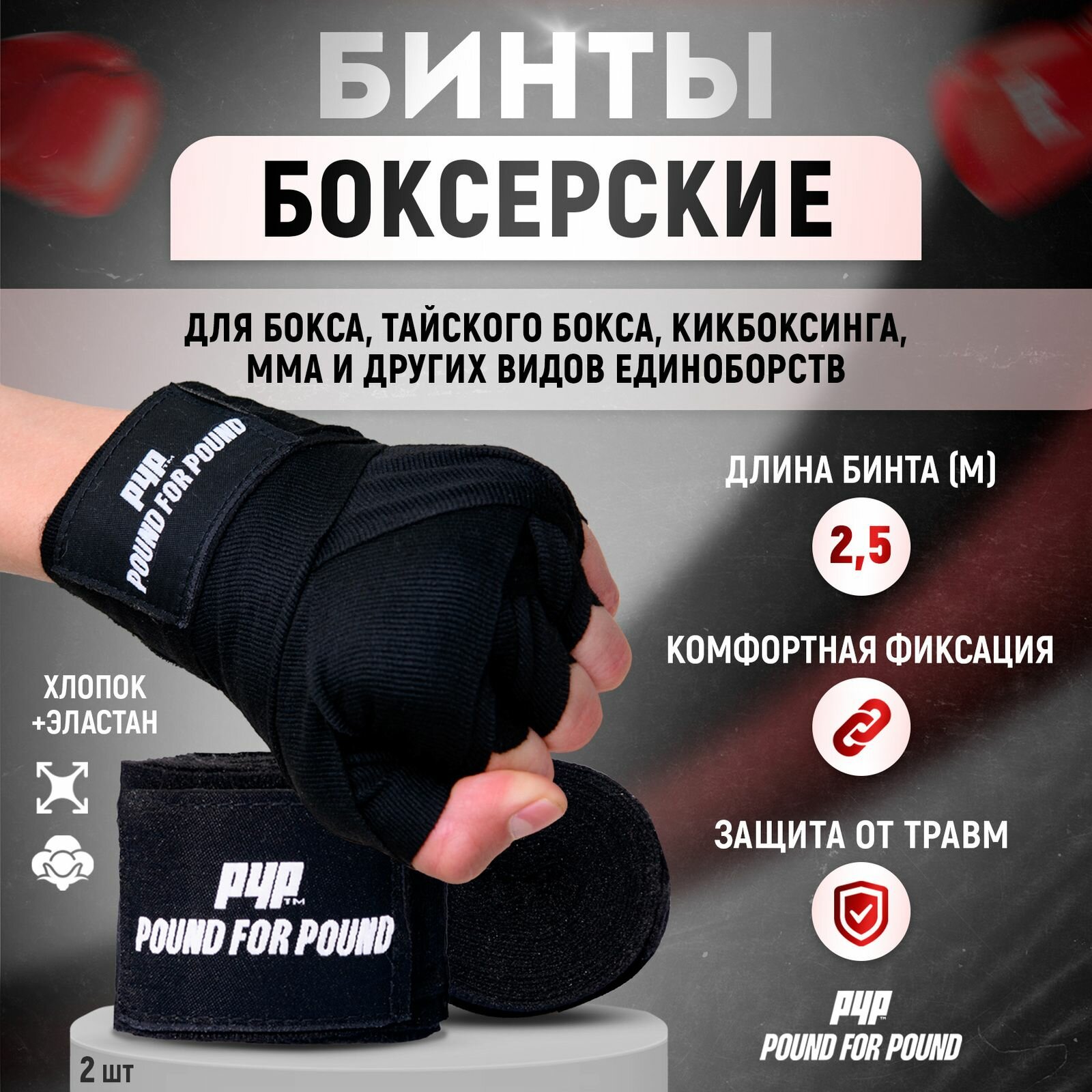 Бинты боксерские эластичные Pound For Pound 2.5 м, черные, 2 шт. информация: