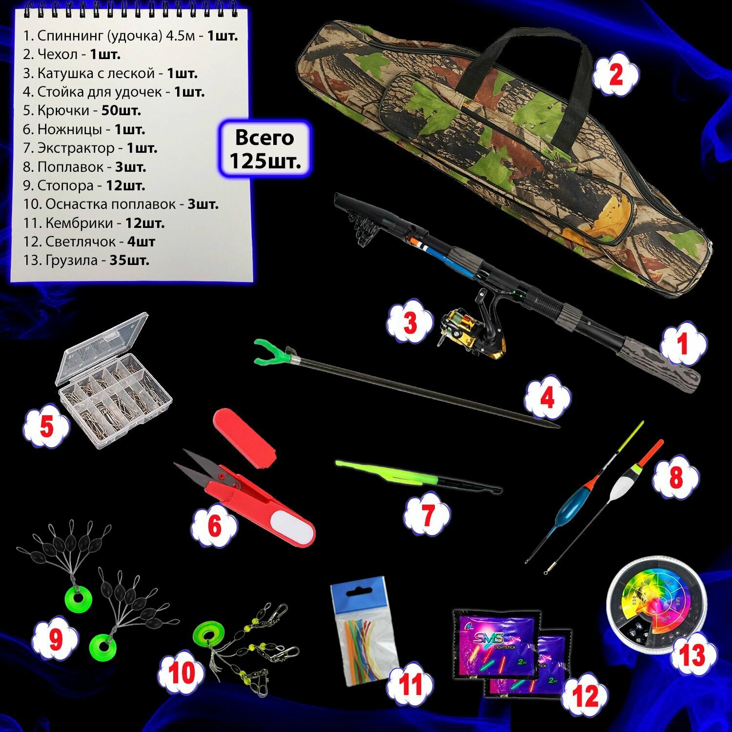 | Дополнительная информация | В наборе: 1. Спиннинг (удочка) 3.0м - 2шт. 2. Чехол - 1шт 3. Подсачек - 1шт 4. Садок - 1шт 5. Стойка для удочек - 2шт 6. Стопора - 12шт 7. Поплавок - 6шт 8. Крючки - 50шт 9. Кембрики - 12шт 10. Оснастка поплавок - 3шт 11. Светлячок - 4шт 12. Колокольчик - 2шт 13. Катушка - 2шт 14. Кормушка - 2шт 15. Экстрактор (разные) - 2шт 16. Ножницы - 1шт 17. Поводок - 2шт 18. Зевник - 1шт 19. Грузики 70гр - 140шт 20. Крючковяз - 1шт 21. Блесна - 2шт |