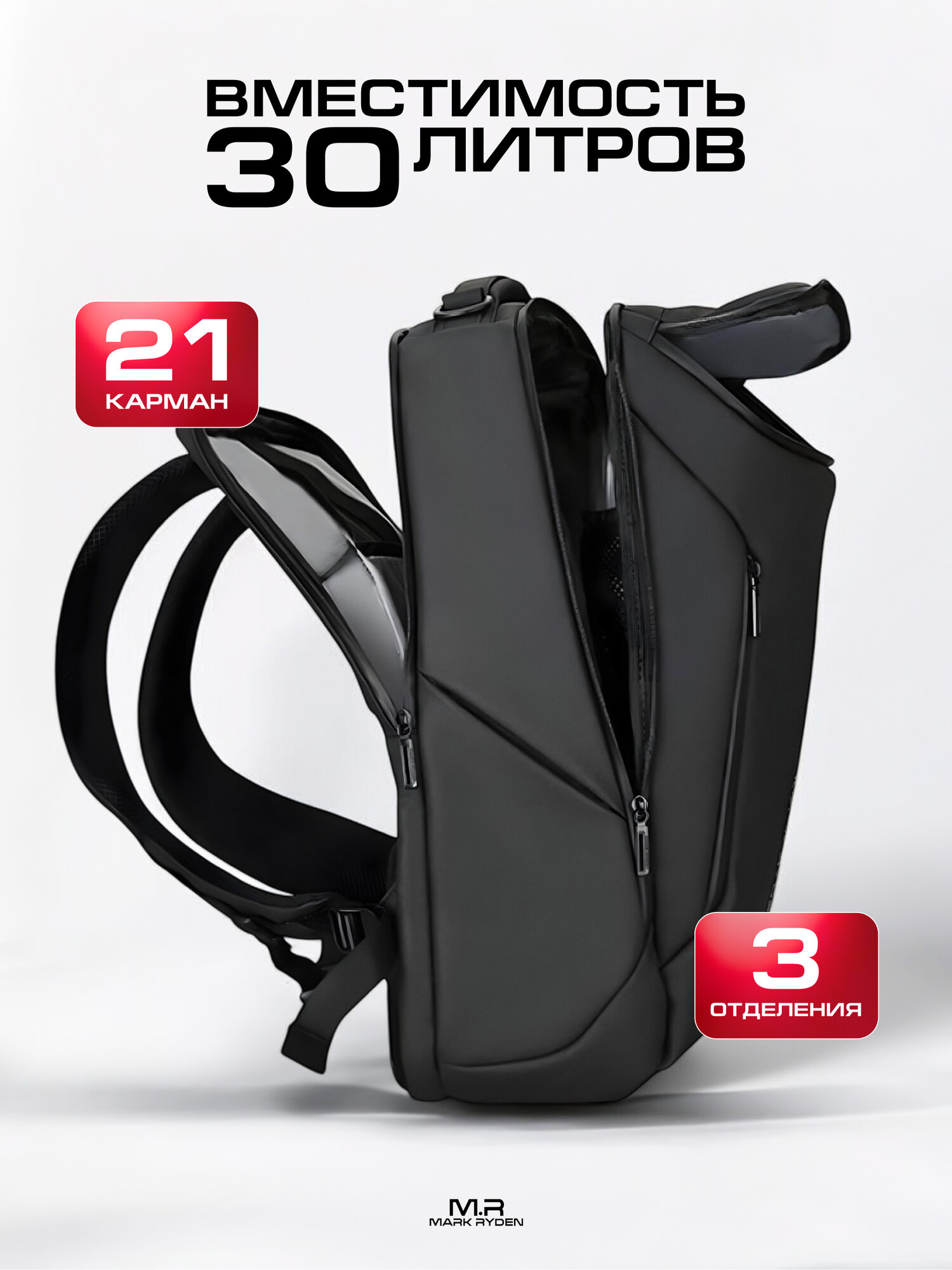 Рюкзак городской дорожный мужской Mark Ryden универсальный 35л, для ноутбука 15.6", с USB портом, черный, водонепроницаемый, молодежный