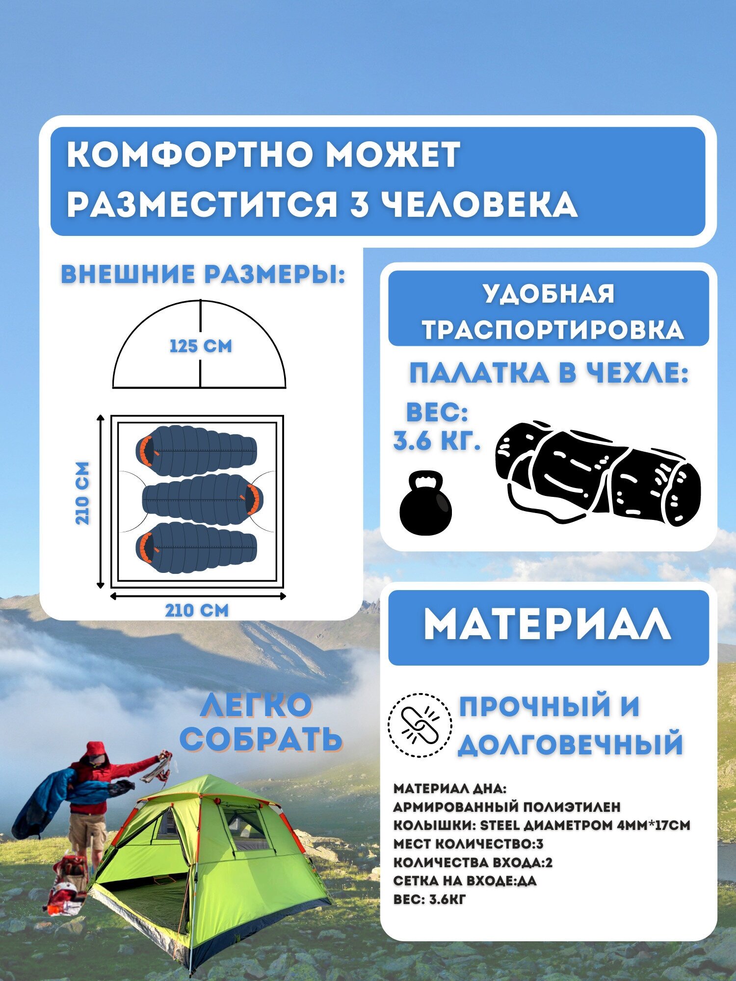 Палатка ART1908, 3-местная, кемпинговая, двухслойная, с тамбуром, зеленая 5 600 ₽