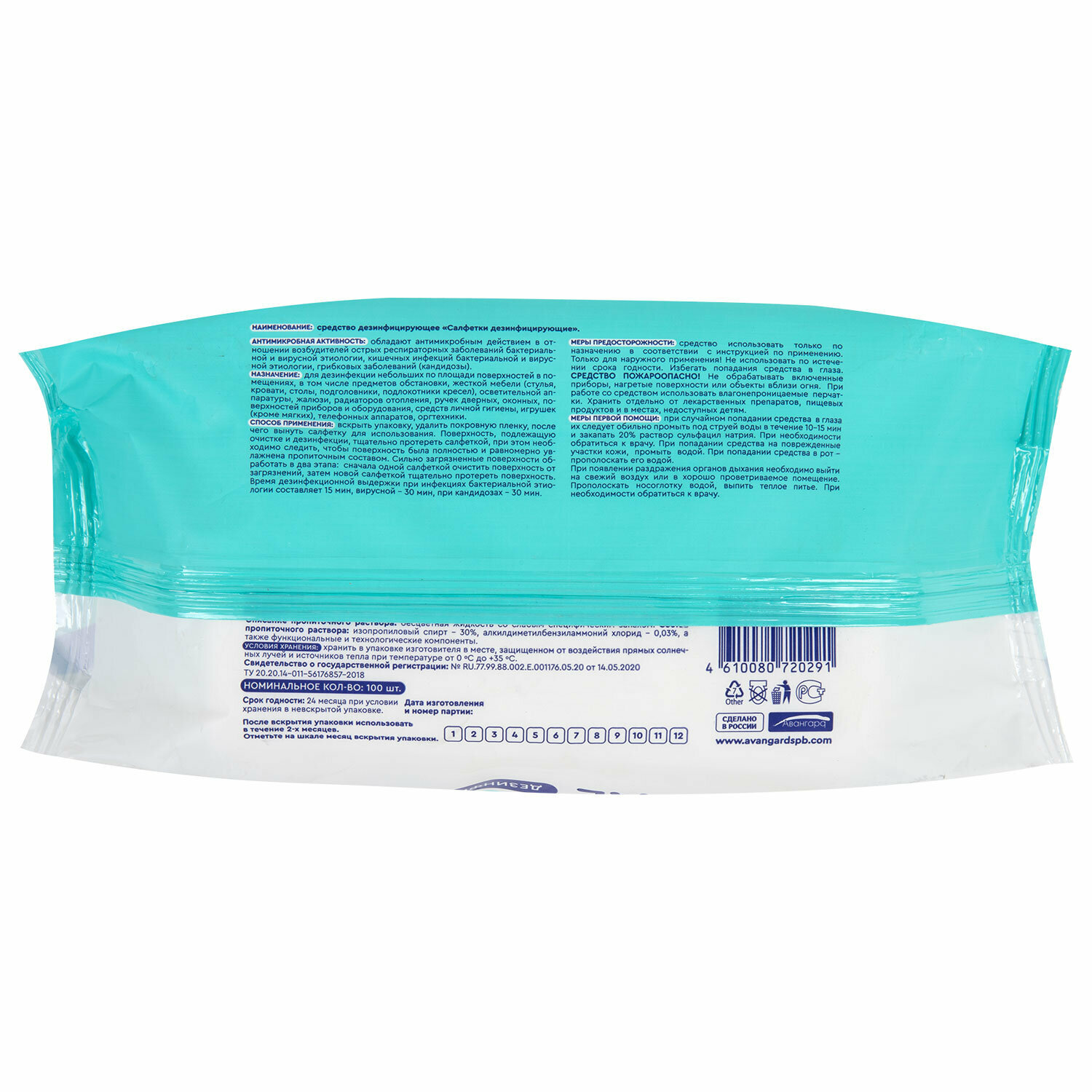 | Способ применения | вскрыть упаковку, удалить покровную пленку, после чего вынуть салфетку для использования; поверхность, подлежащую очистке и дезинфекции, тщательно протереть салфеткой, при этом необходимо следить, чтобы поверхность была полностью и равномерно увлажнена пропиточным составом; сильно загрязненные поверхности обработать в два этапа: сначала одной салфеткой очистить поверхность от загрязнений, затем новой салфеткой тщательно протереть поверхность; время дезинфекционной выдержки при инфекциях бактериальной этиологии составляет 15 минут, вирусной – 30 минут, при кандидозах – 30 минут |