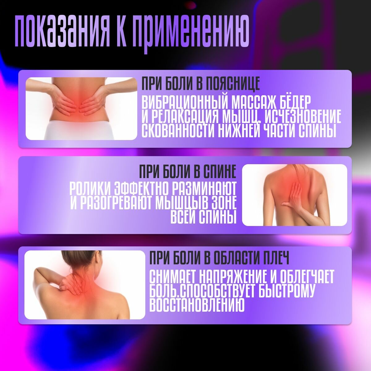 | Зона массажа | плечи / поясница / спина / шея / ягодицы |