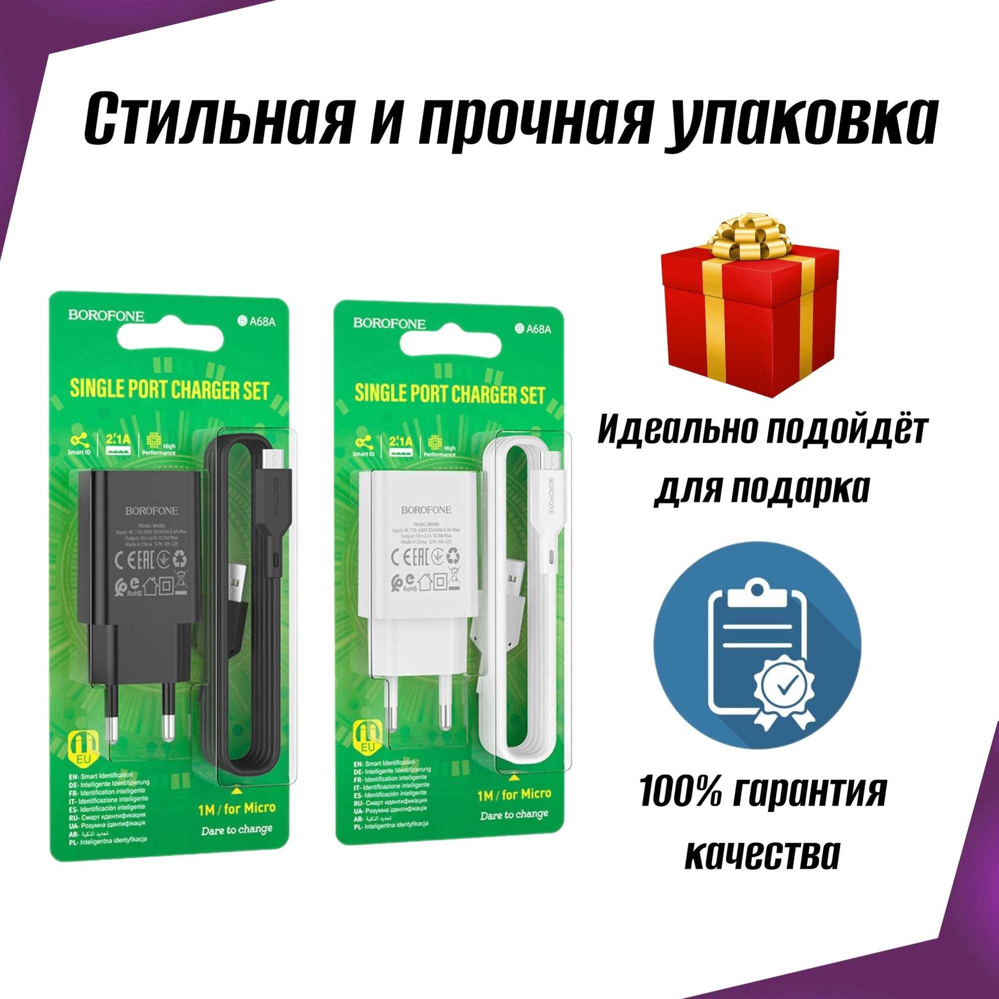 Сетевое зарядное устройство 1USB Borofone BA68A, Glacier, с кабелем микро USB, 5V/2.1A черное 280 ₽