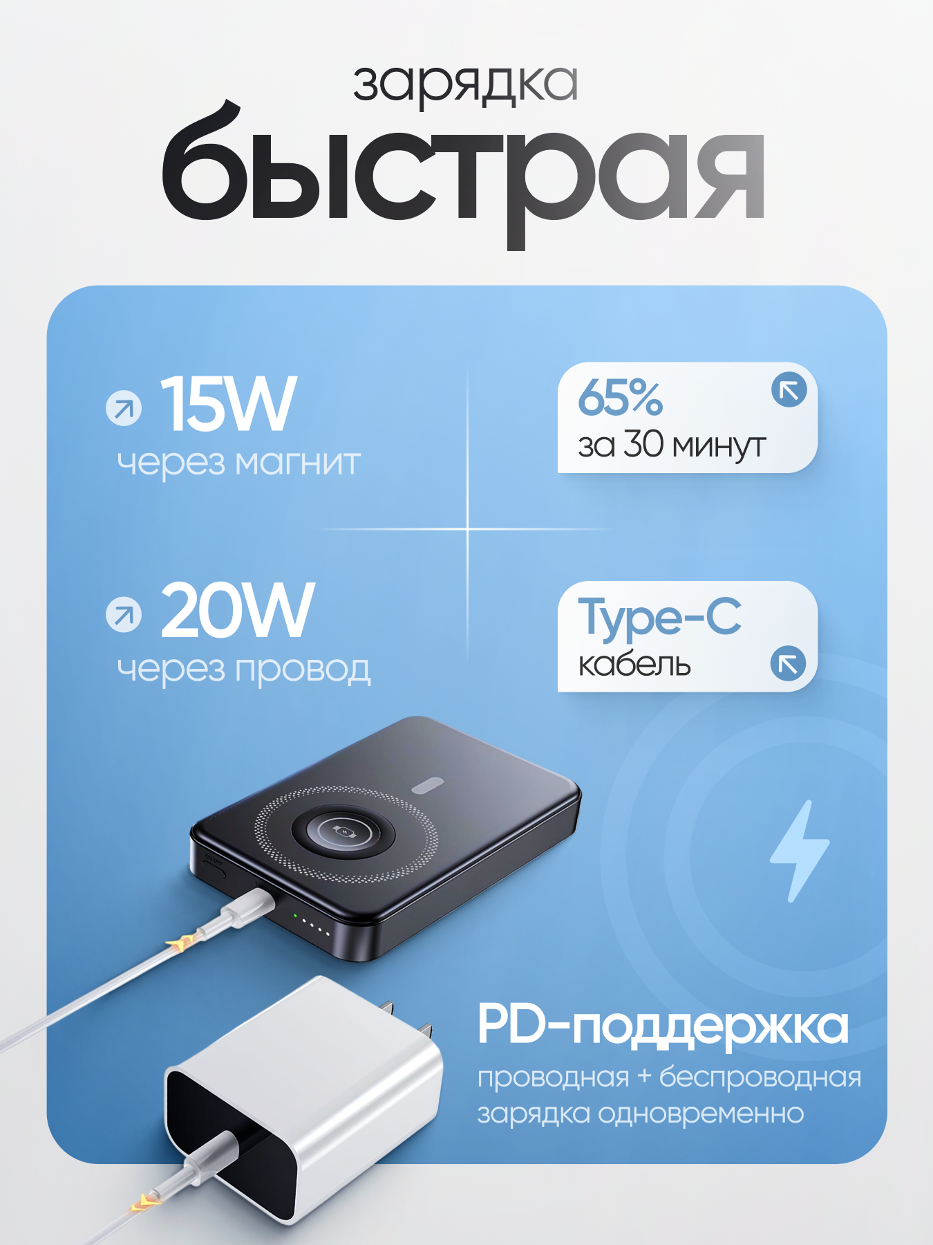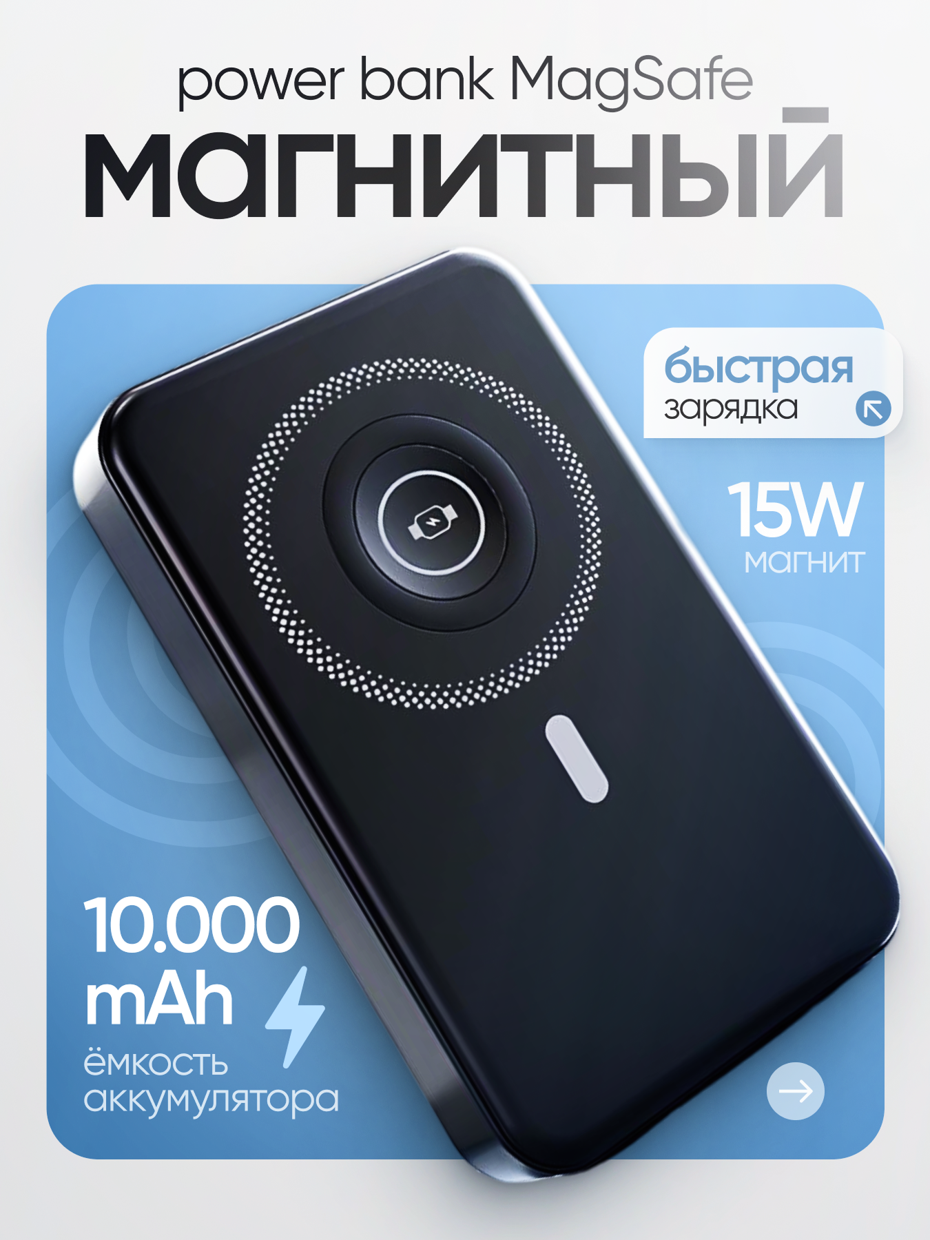 Повербанк Powerbank MagSafe 10000mAh с быстрой зарядкой, внешний аккумулятор для телефона iPhone, Xiaomi, Samsung информация: