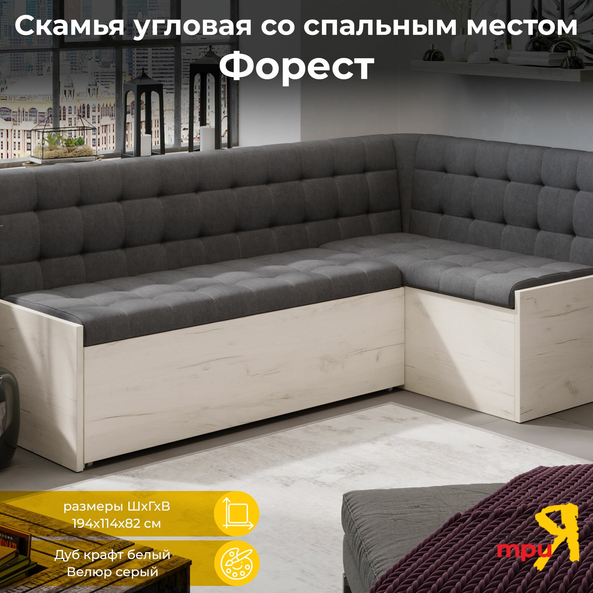 Отзывы на Кухонный уголок Скамья угловая со спальным местом Форест Дуб крафт белый/Велюр серый