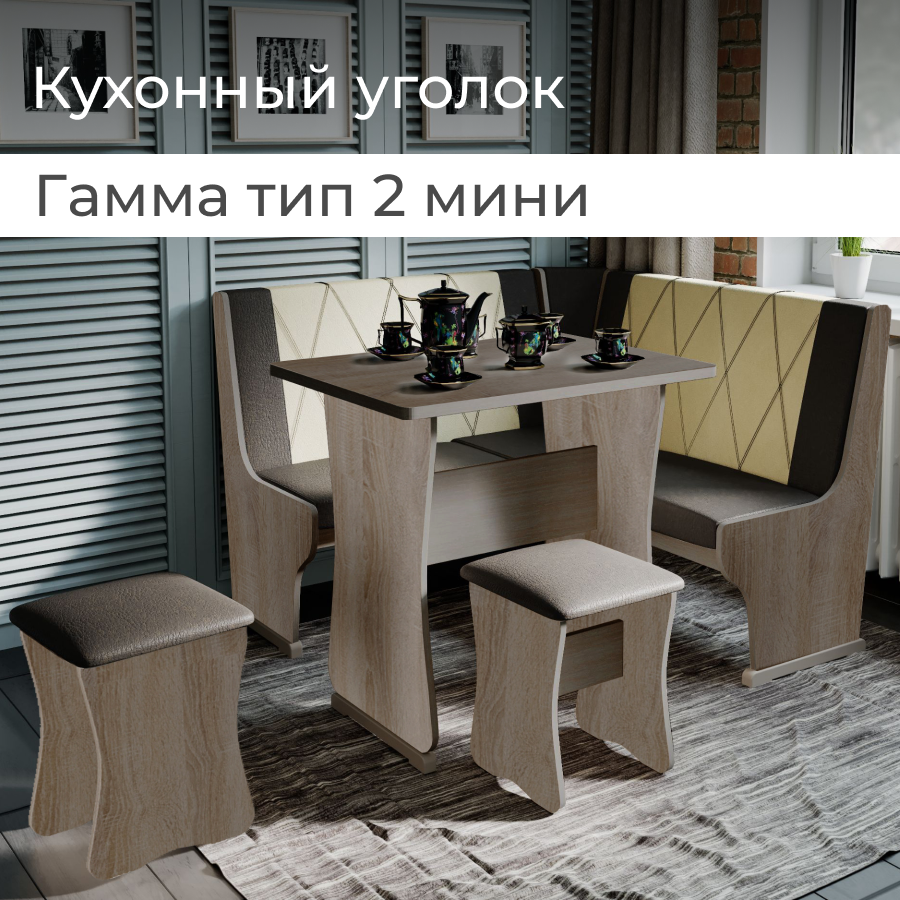 Кухонный уголок BONMEBEL Гамма Тип 2 Мини, ЛДСП Дуб Сонома трюфель/КЗ Шоколад/Бежевый, стол, диван, табуреты информация: