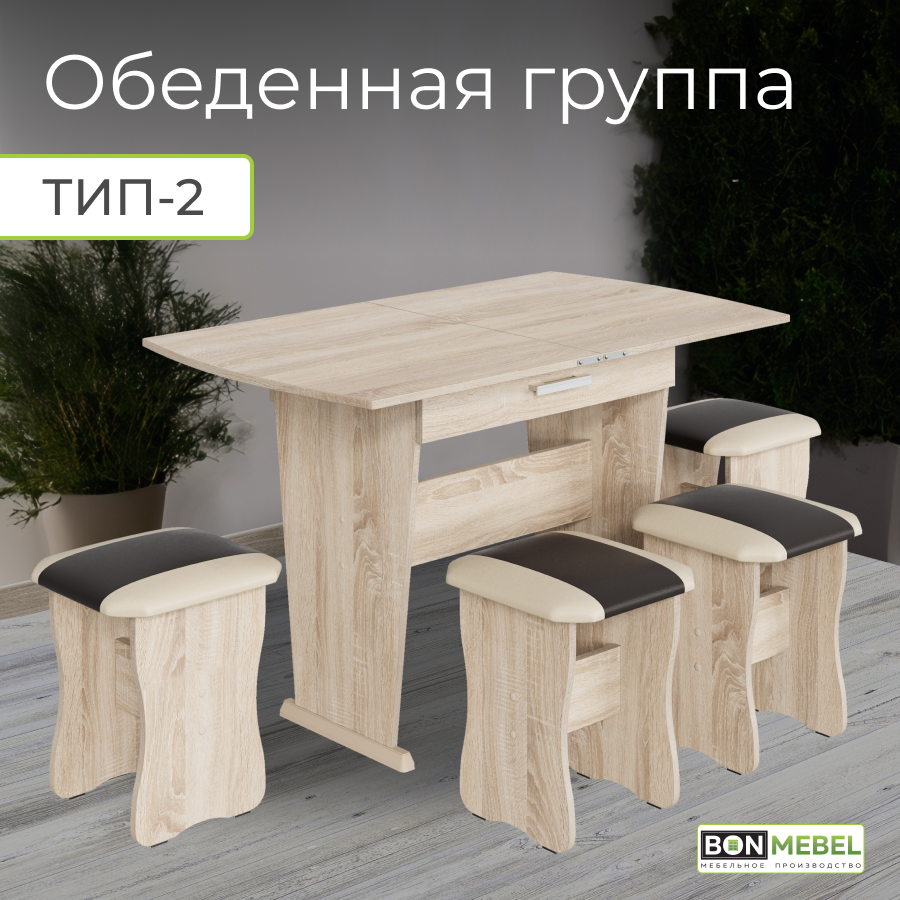 Обеденная группа BONMEBEL Тип 2, ЛДСП дуб сонома/КЗ шоколад/беж, с ящиком, стол раскладной, табуреты, кухонный комплект информация: