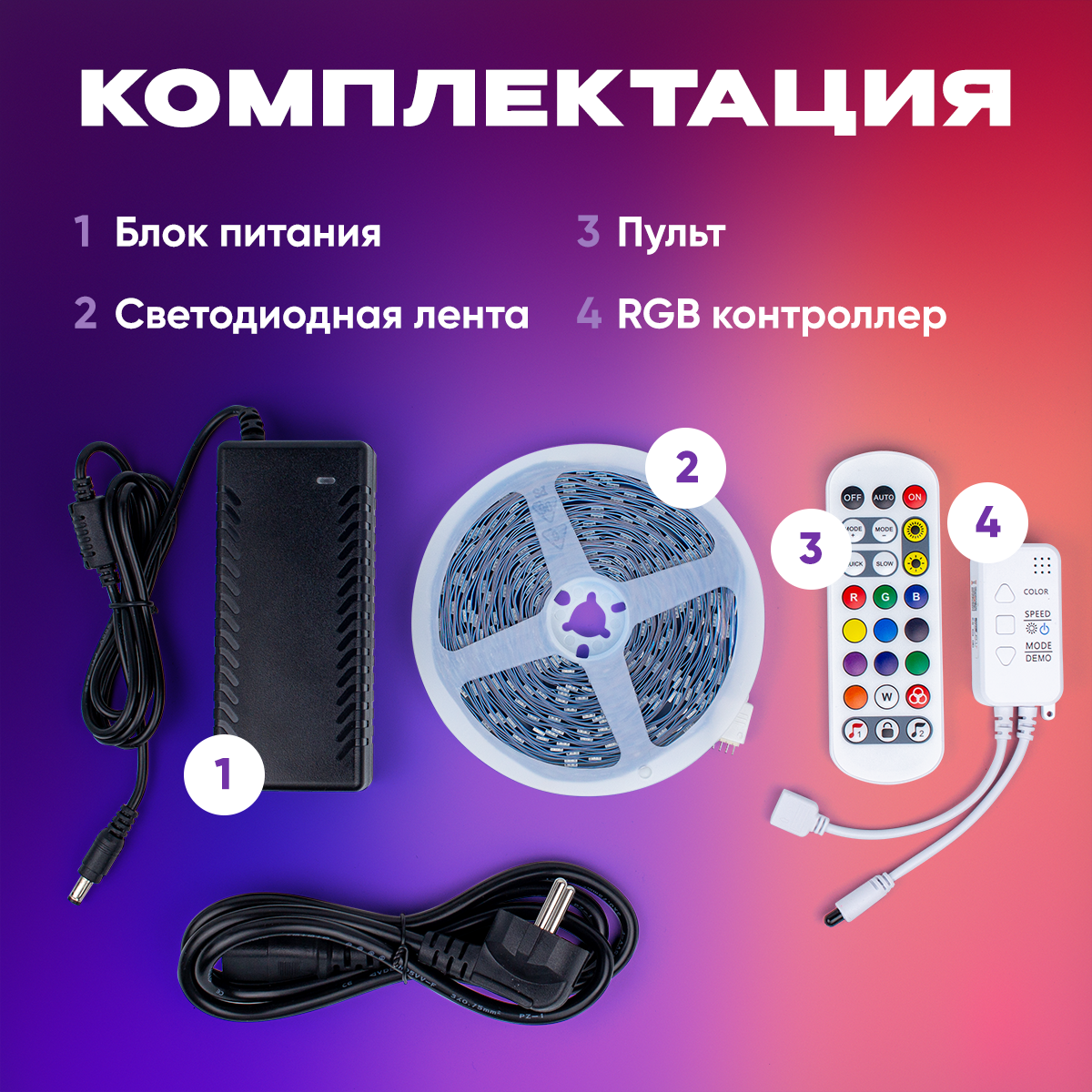 | Комплектация | блок питания 12В, пульт дистанционного управления, батарейка, RGB-контроллер, светодиодная лента |