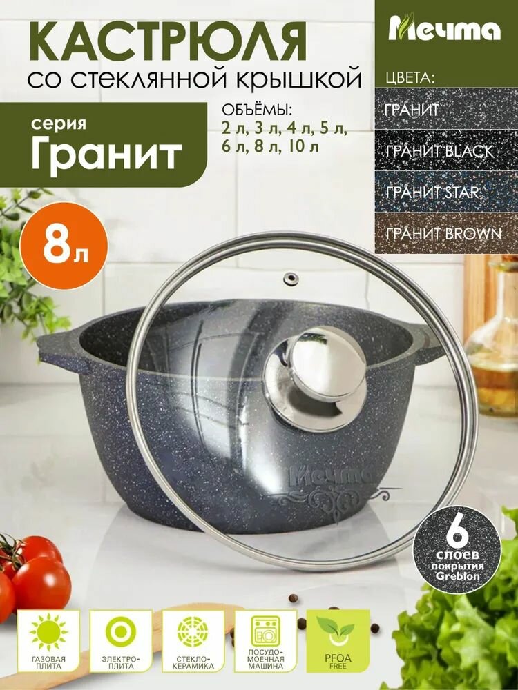 Кастрюля "Мечта" 6л Гранит с антипригарным покрытием с крышкой BLACK 3 663 ₽