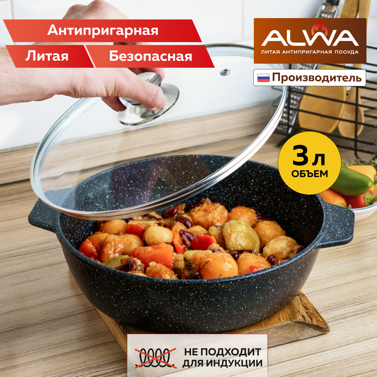 10 цен на Жаровня с крышкой ALWA литая с антипригарным покрытием 3 литра сотейник мрамор
