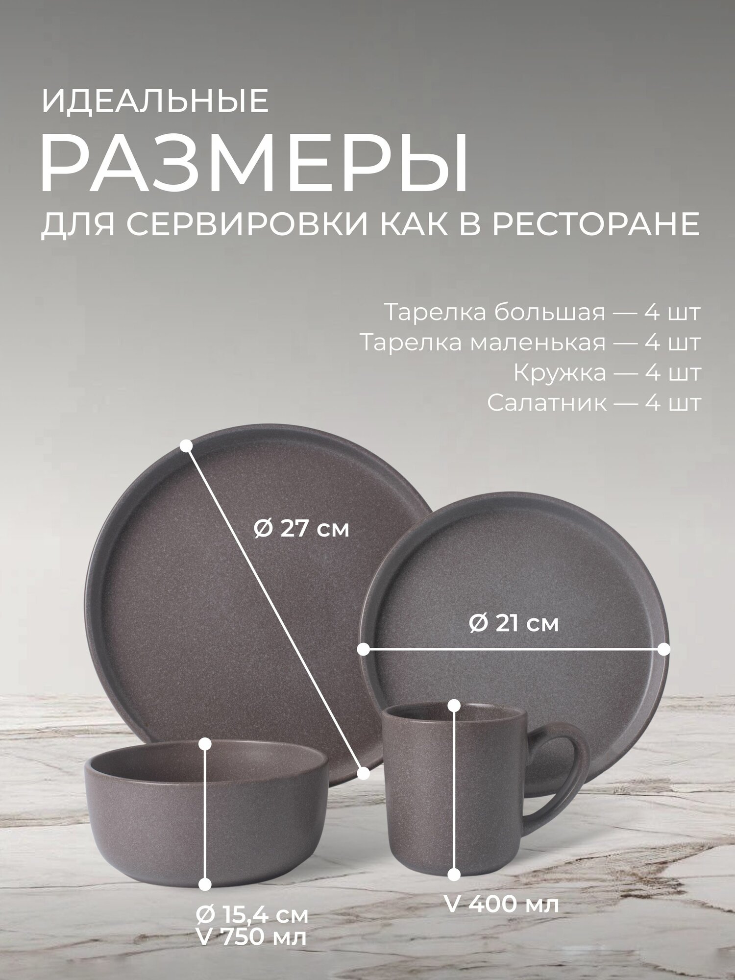 | Комплектация | обеденная тарелка 27 см - 4 шт., тарелка 19,5 см - 4 шт., салатник 15,5 см - 4 шт, кружка 350 мл - 4 шт. |
