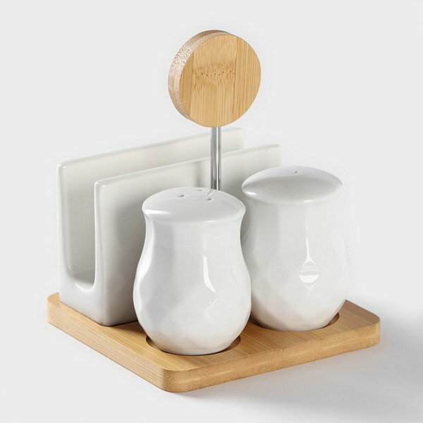 Отзывы на Набор для специй 4 предмета: солонка 110 мл, перечница 110 мл, салфетница, на бамбуковой подставке, фарфор, белый