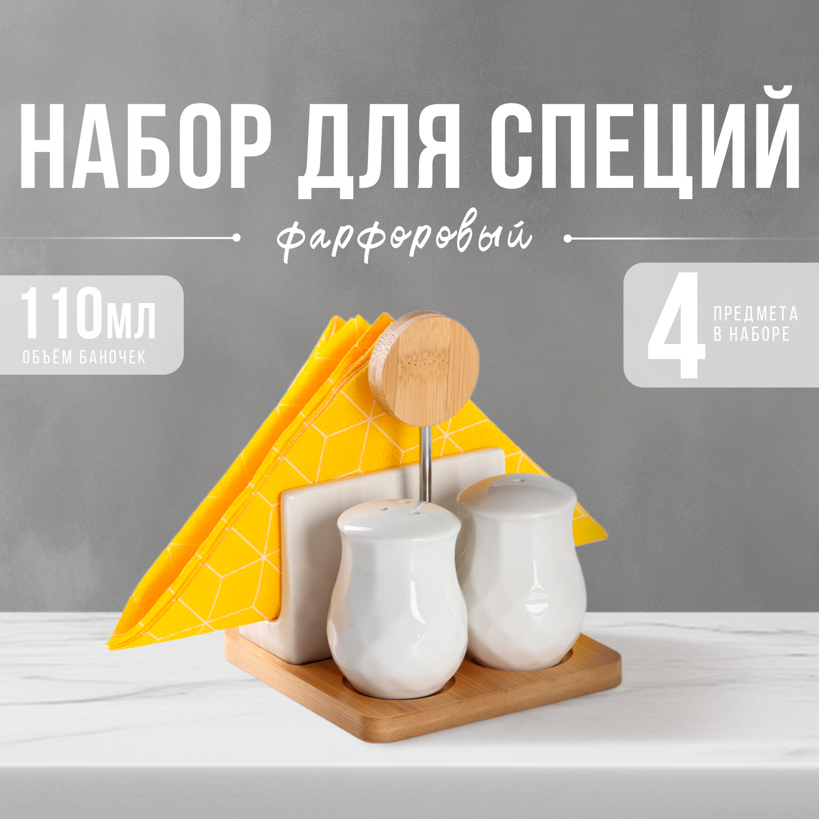 Набор для специй Доляна «Эстет», 4 предмета: солонка 110 мл, перечница 110 мл, салфетница, подставка цвет белый 696 ₽